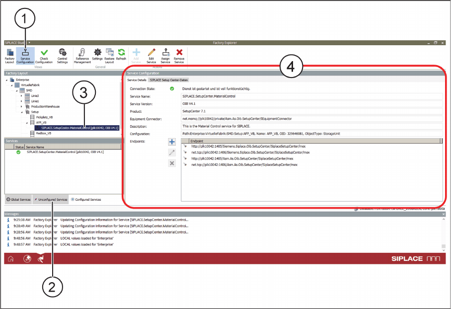 ► In the Unconfigured Services tab (2), find the service Siplace.SetupCenter.MaterialControl.