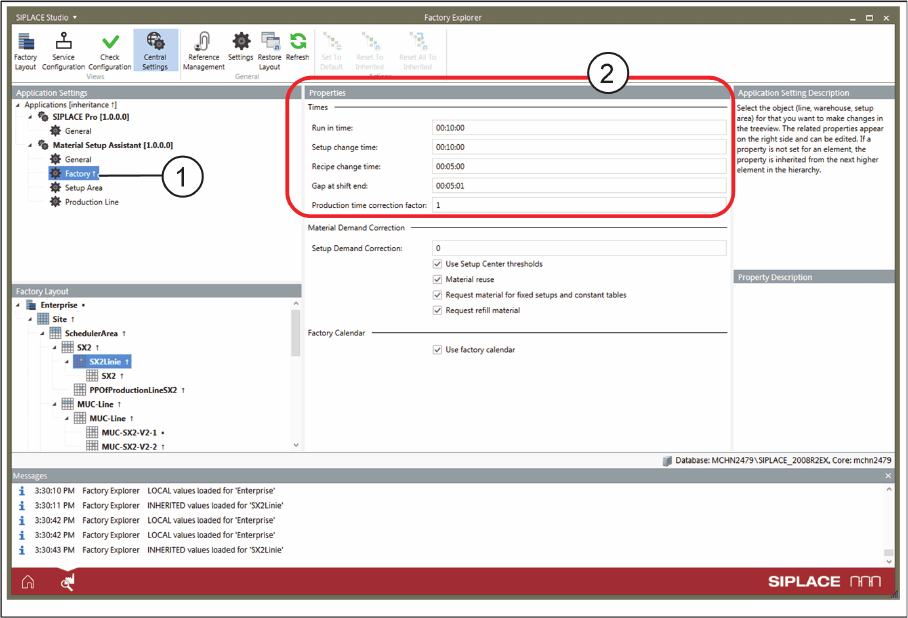 ► Go to Application Settings => Material Setup Assistant and select Factory (1) from the tree structure.