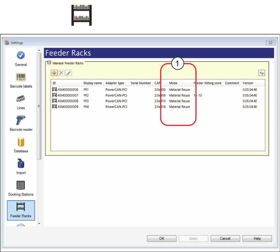► The Material Reuse mode (1) must be activated for the feeder racks used. Correct this setting, if nec
