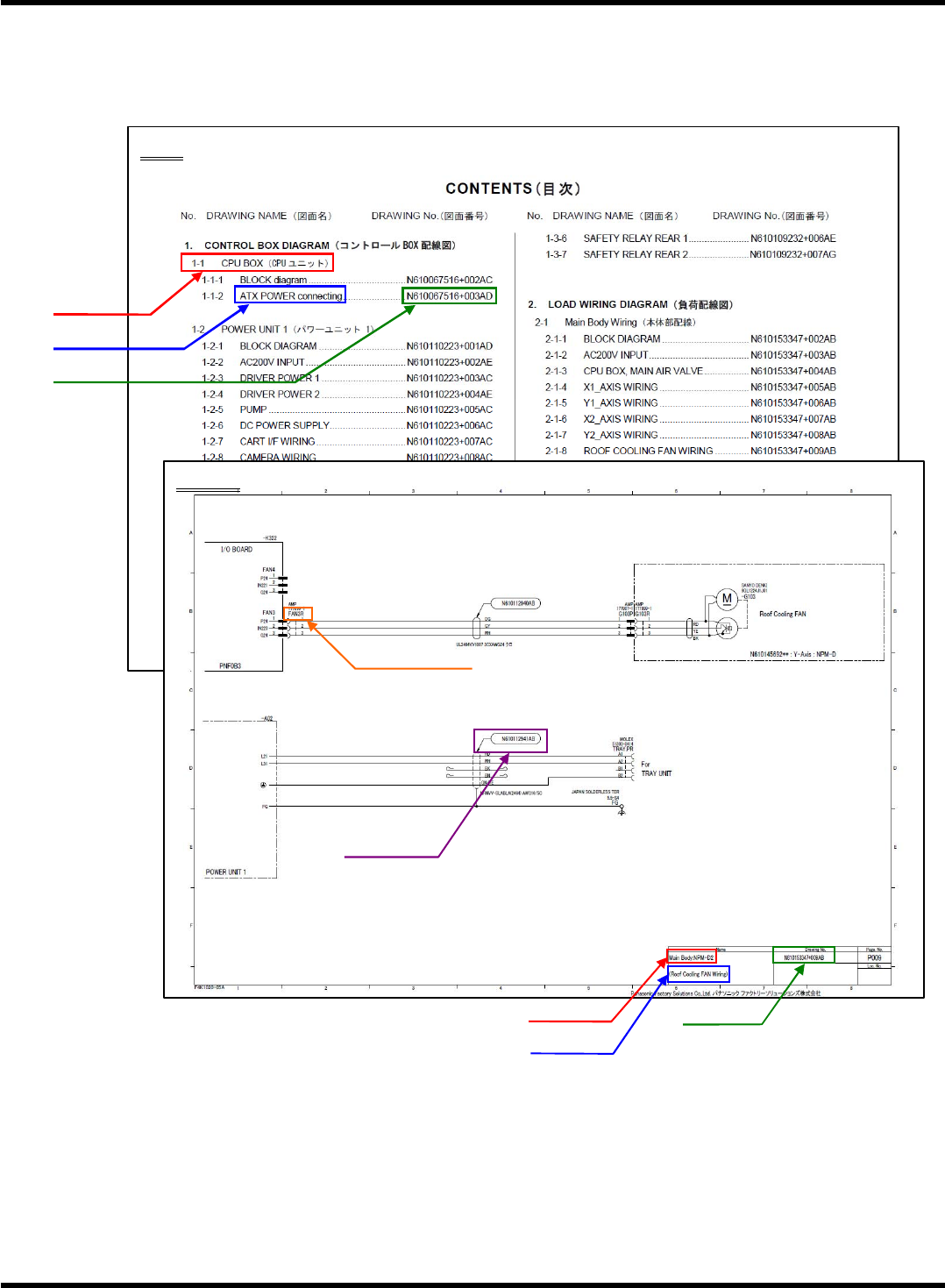 制御配線図 Page 2 D00ABJ -00-602-00 制御配線図の見 方につ いて 1. 目次と配線図の 見方 <表記説明> キット :製 品に使 用され ている キット(ユニ ット )の名称 図面名 :図 面に付 与され ている タイトル名 図面番号 :図 面に付 与され ている 番号 コネクター番号 : コネク ターに 付与されてい る番 号 ケーブル発注品 番 : ケーブ ルに付 与されている 発注 するため の品番 …