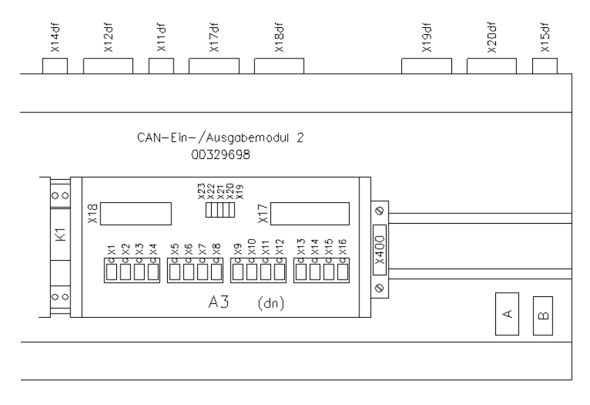 : Überprüfen Sie alle Steckverbindungen zum CAN-E/A-Modul 2 (A3) gemäß Abb. 1 - 4.