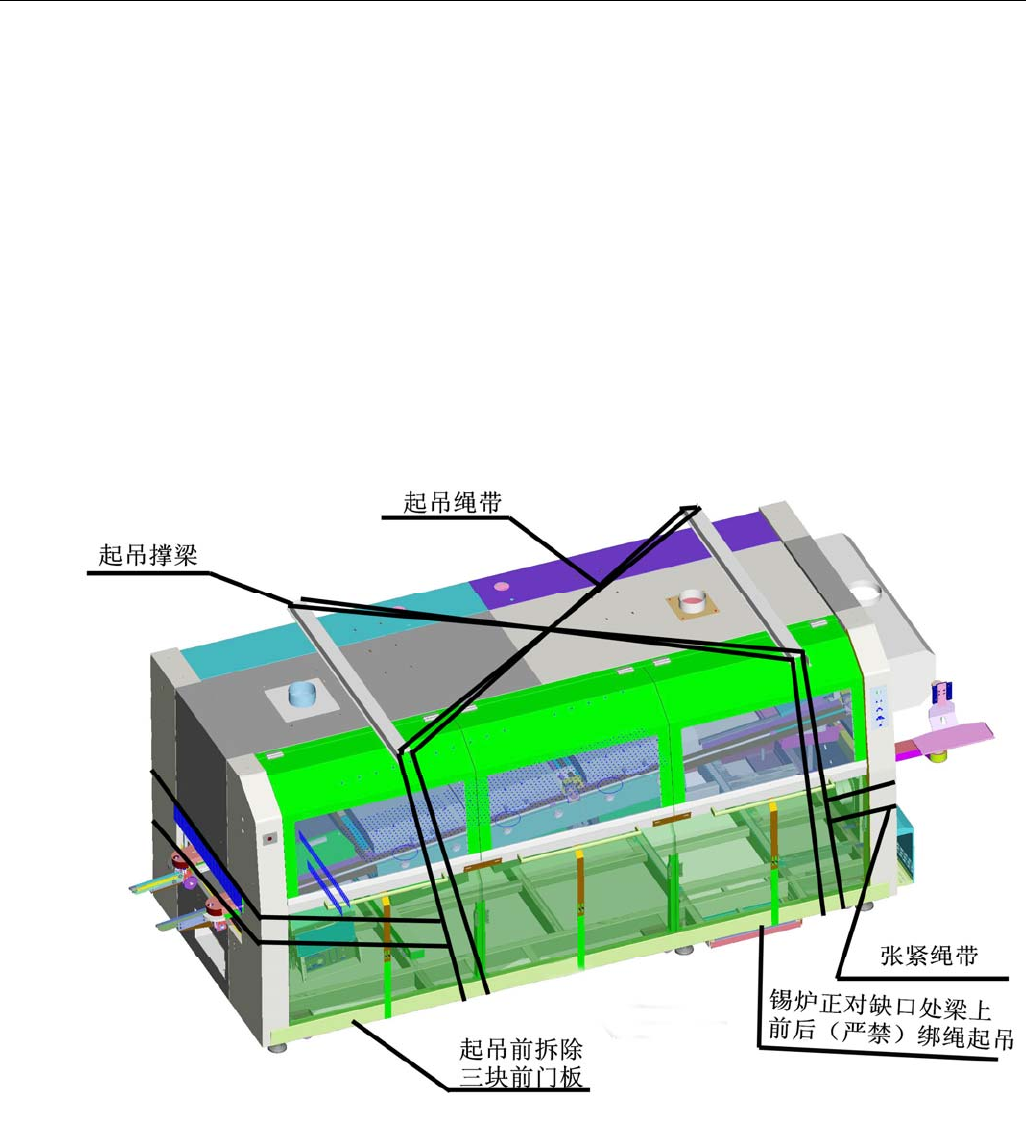 注意事项:1、选择机器受力部位进行吊装或支撑,2、机器的薄弱部位禁止推拉,如玻璃门、紧急制、工控机