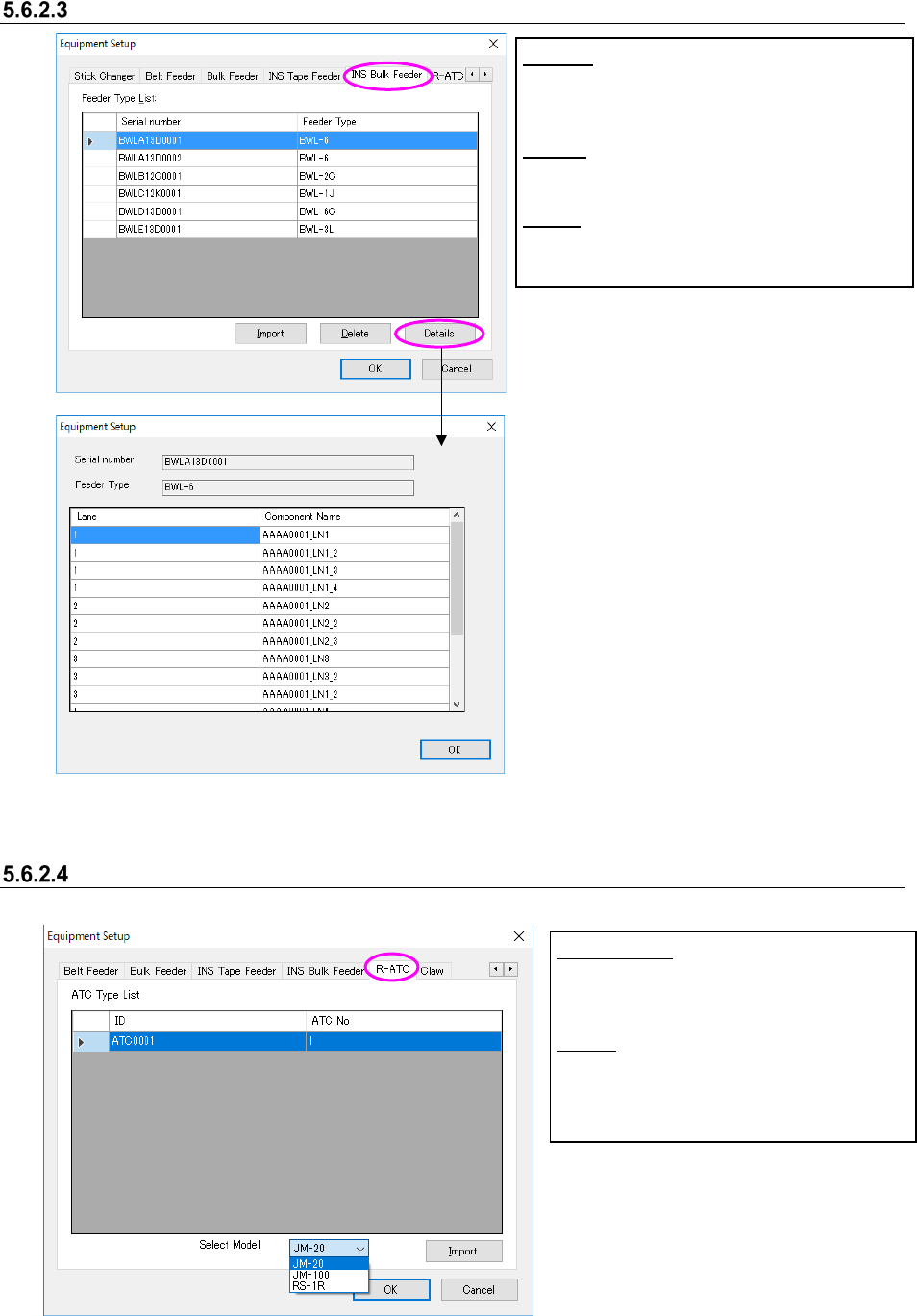 Figure 5.6-11 “Equipment Setup” screen (INS bulk feeder)