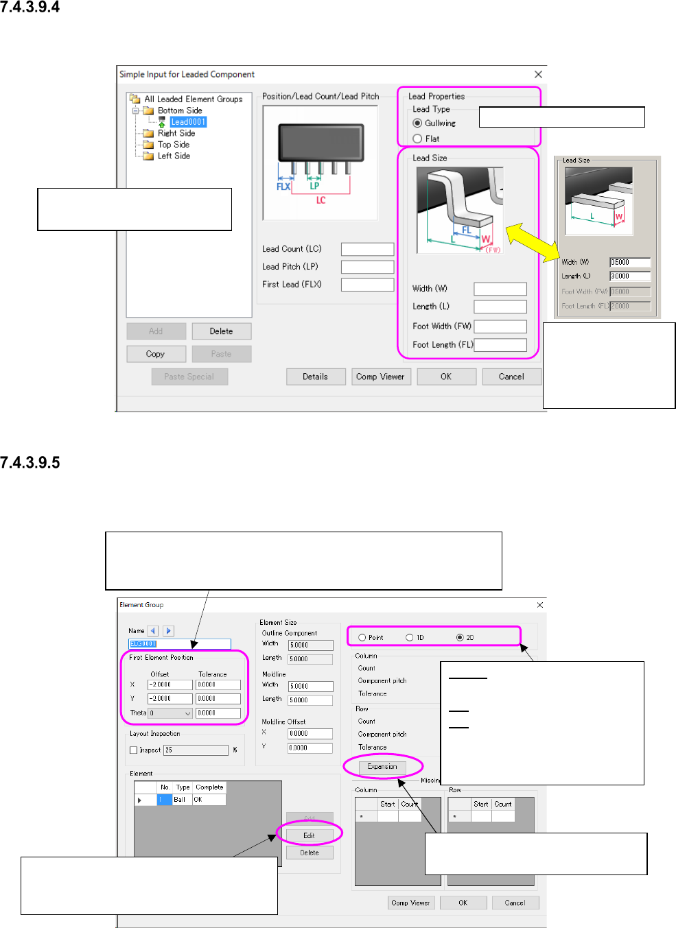JaNets In structio n Manual 7. Program Editor 7- 71 “ Simple Input for Lead ed Component ” screen This scre en allows you to set data su ch as the nu mb er of leads, the lead pitch, the lead length a nd the lead width o …