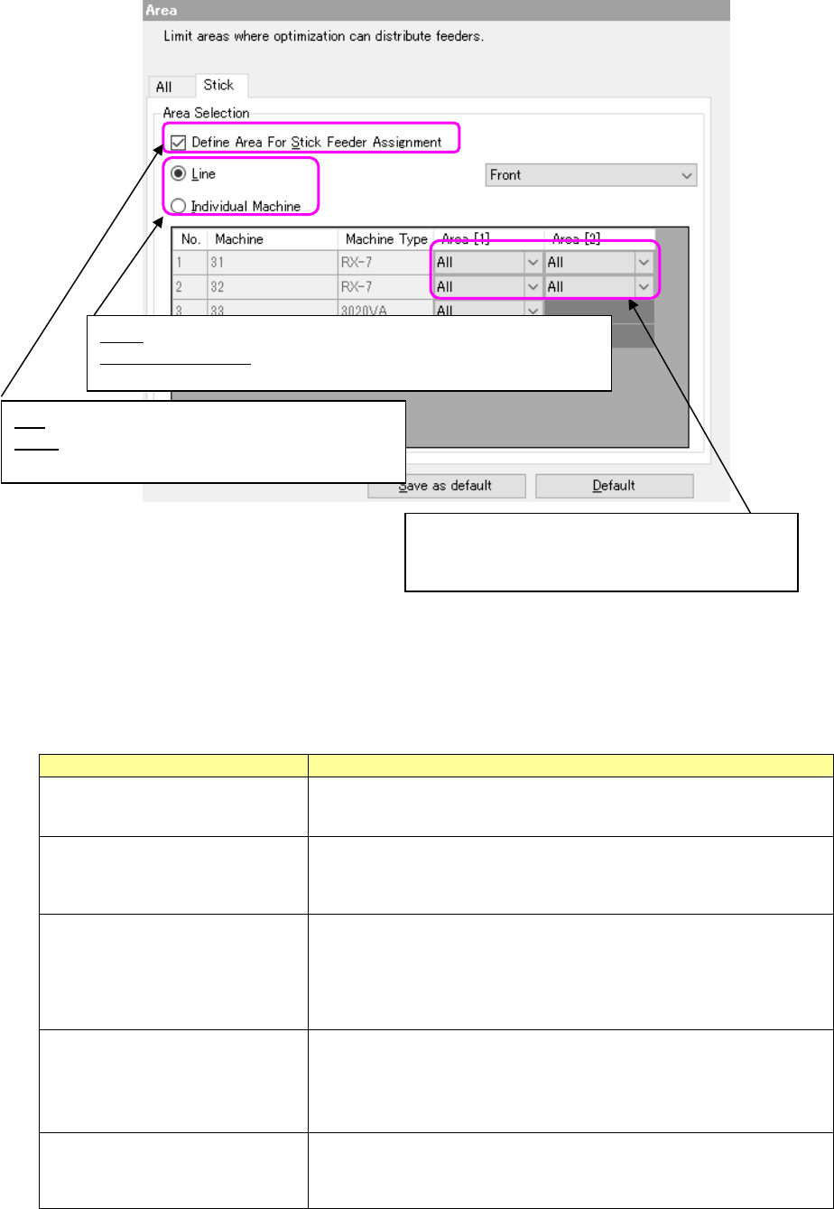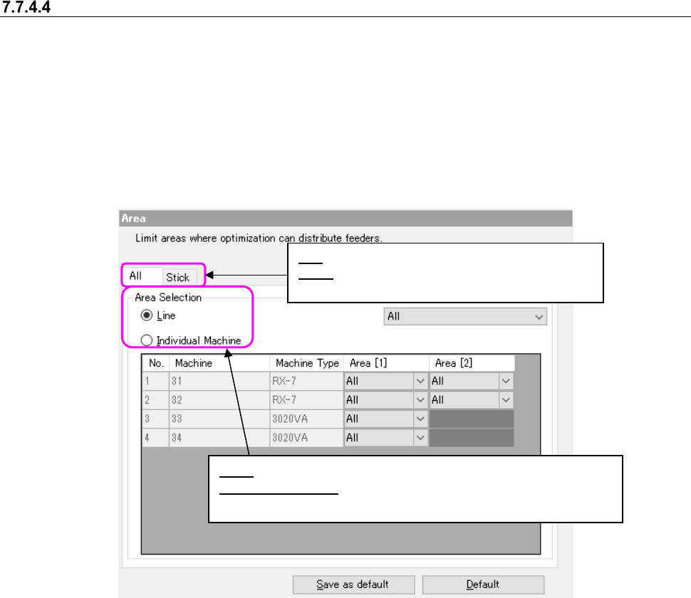 There are two types of setting objects, namely, “All” and “Stick.” Each area setting can be per-