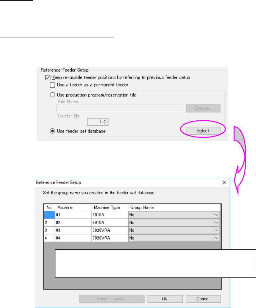 JaNets In structio n Manual 7. Program Editor 7- 167 Reference feeder option Reference Feeder Setup T he syste m refers to t he feeder set i nfor mation of other product ion progra ms or res ervat ion files and makes t h…