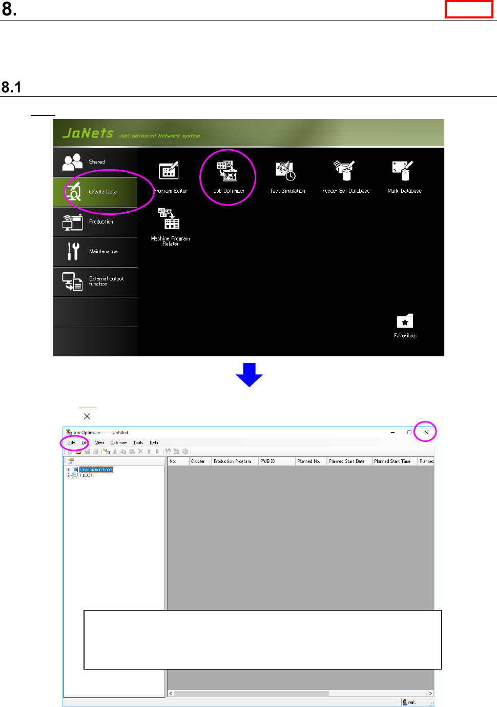 JaNets Instr ucti on Man ual 8. Job Optim izer 8-2 Menu St ruc tu re Ta b l e 8.2 -1 Menu items Menu item Description File (F) New (N) Ctrl + N Creates a n ew Reser vation list “producti on program reservati on area.” Op…