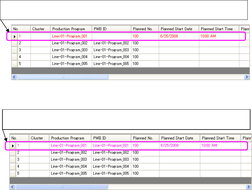 A production program whose data has not been completely created is displayed in pink