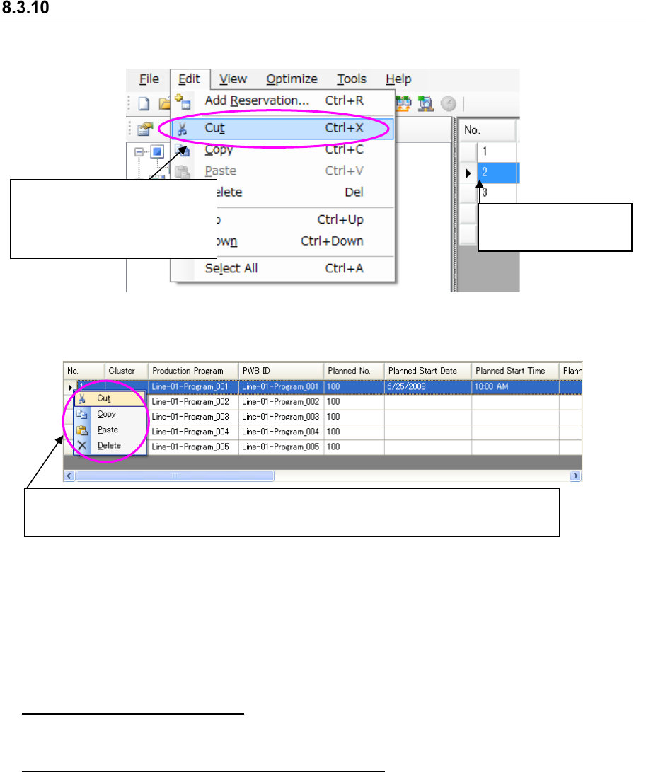 JaNets Instr ucti on Man ual 8. Job Optim izer 8- 21 Reserv ation l ist – Cu t/Co py/Past e/Del ete of a reserv atio n T o cut/copy /past e/delete a reservat ion, foll ow the op erations in dicated with ① a nd ② or ③ . F…