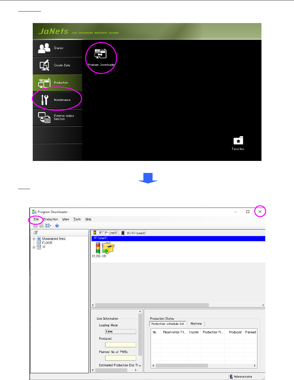 Start-up: Double-click the "Production" tab from the JaNets Launcher, and then the "Program