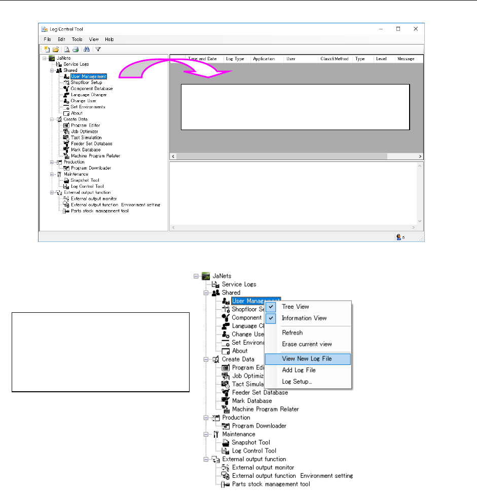 J aN et s Inst ructi on Manual 15 . Log Control Tool 15 -8 15.2 O perati ons 15.2.1 Se tt ing up o utput of a l og After sel ecti ng an i tem f r om the T ree View f or ap p li cati ons, s elect the [T ool s] c om m and …