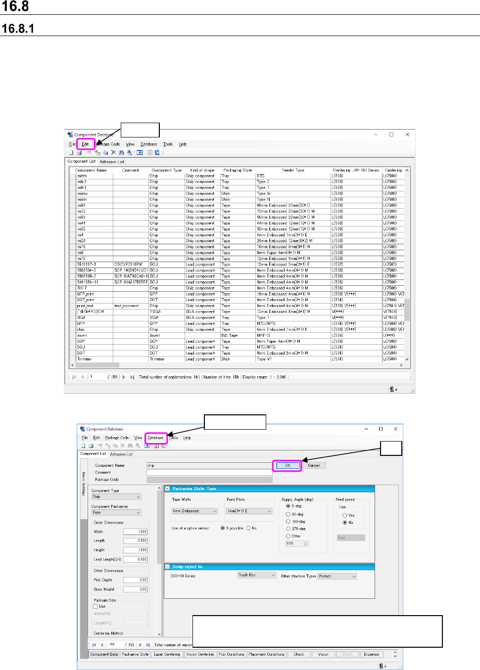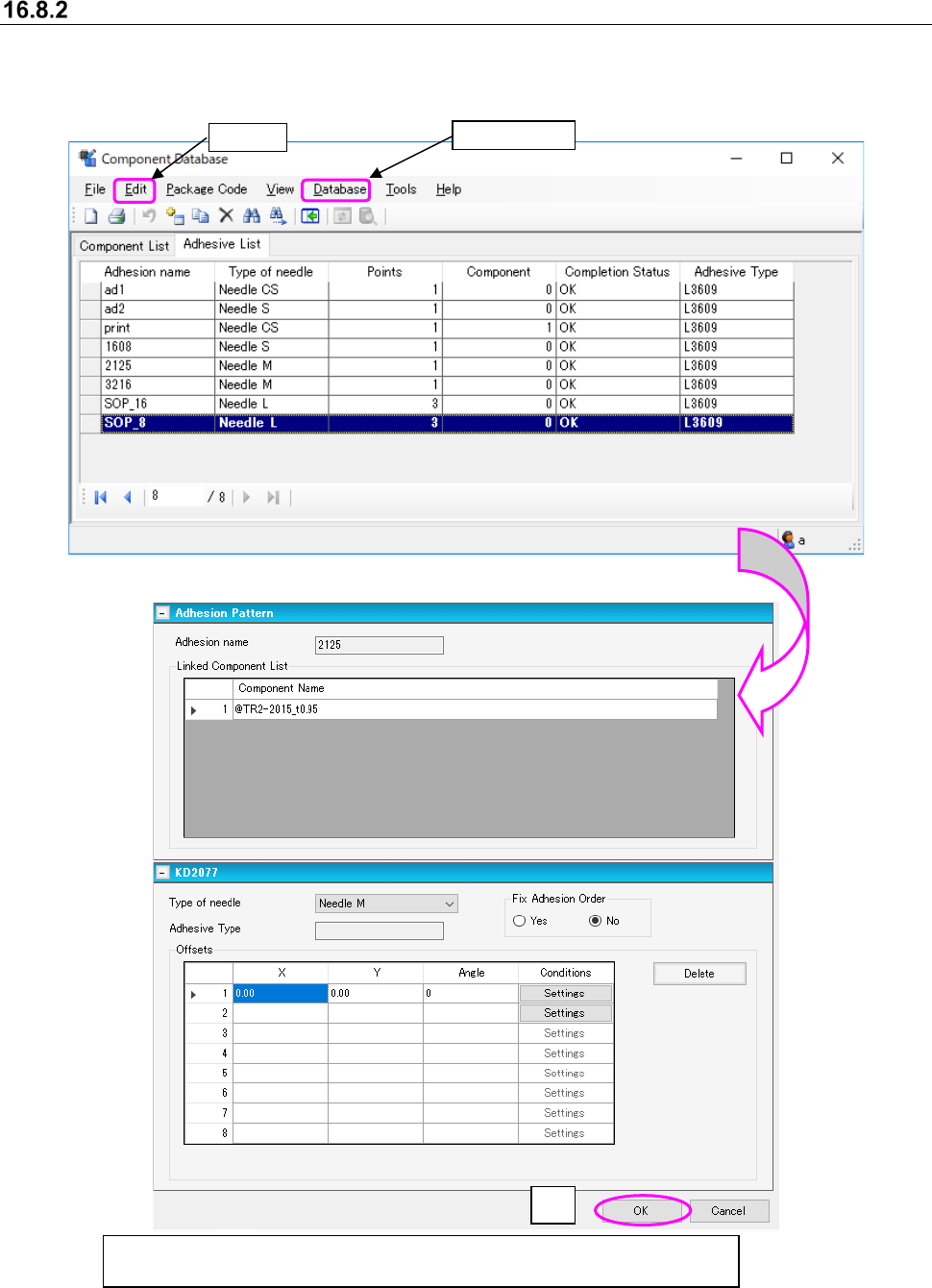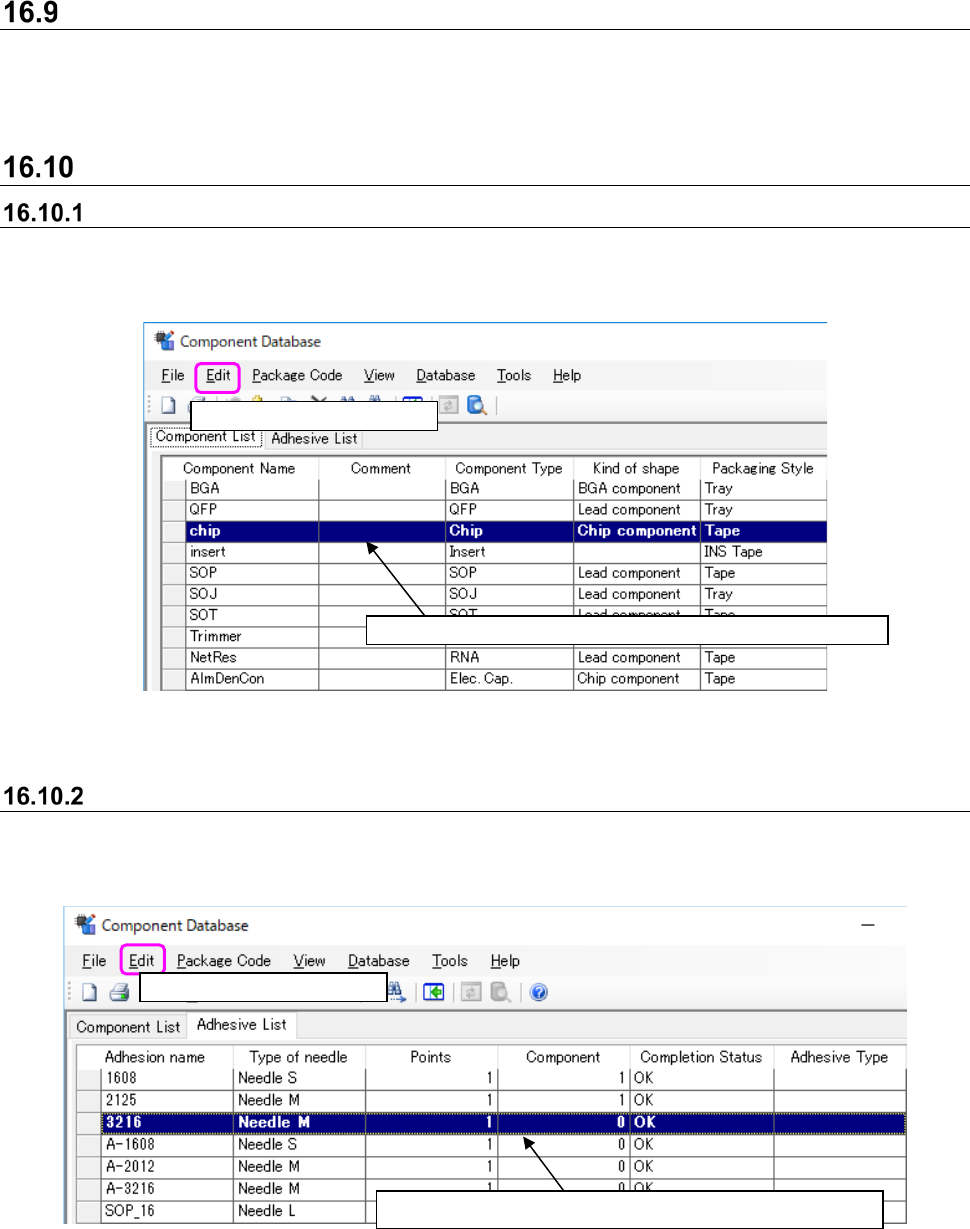 JaNets In structio n Manual 16 Component D ataba se 16 - 28 Adhesion da ta changes Select data t o be chang ed from the adhes ion dat abase o ver view scr een, t hen select ① [Ed it] - [Change] or double cl ick and the s…