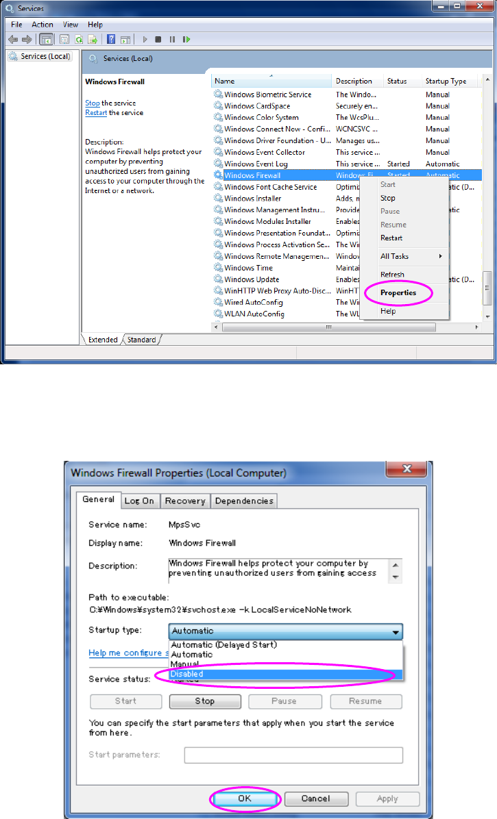 (3) If “Started” is displayed in the “Status” cell of the “Windows Firewall” on the “Services” menu,