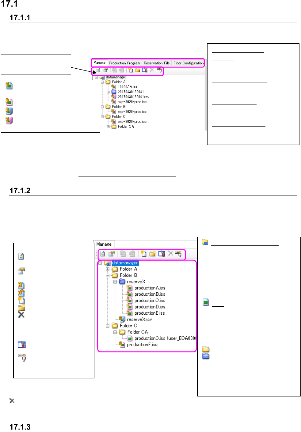 JaNets In structio n Manual 17 Program Expl orer 17 -2 D escriptions of the screens About the program expl orer The Program Explorer h as the following s cree ns: “ Manag e, ” “ Productio n Program , ” “ Reser vatio n Fi…