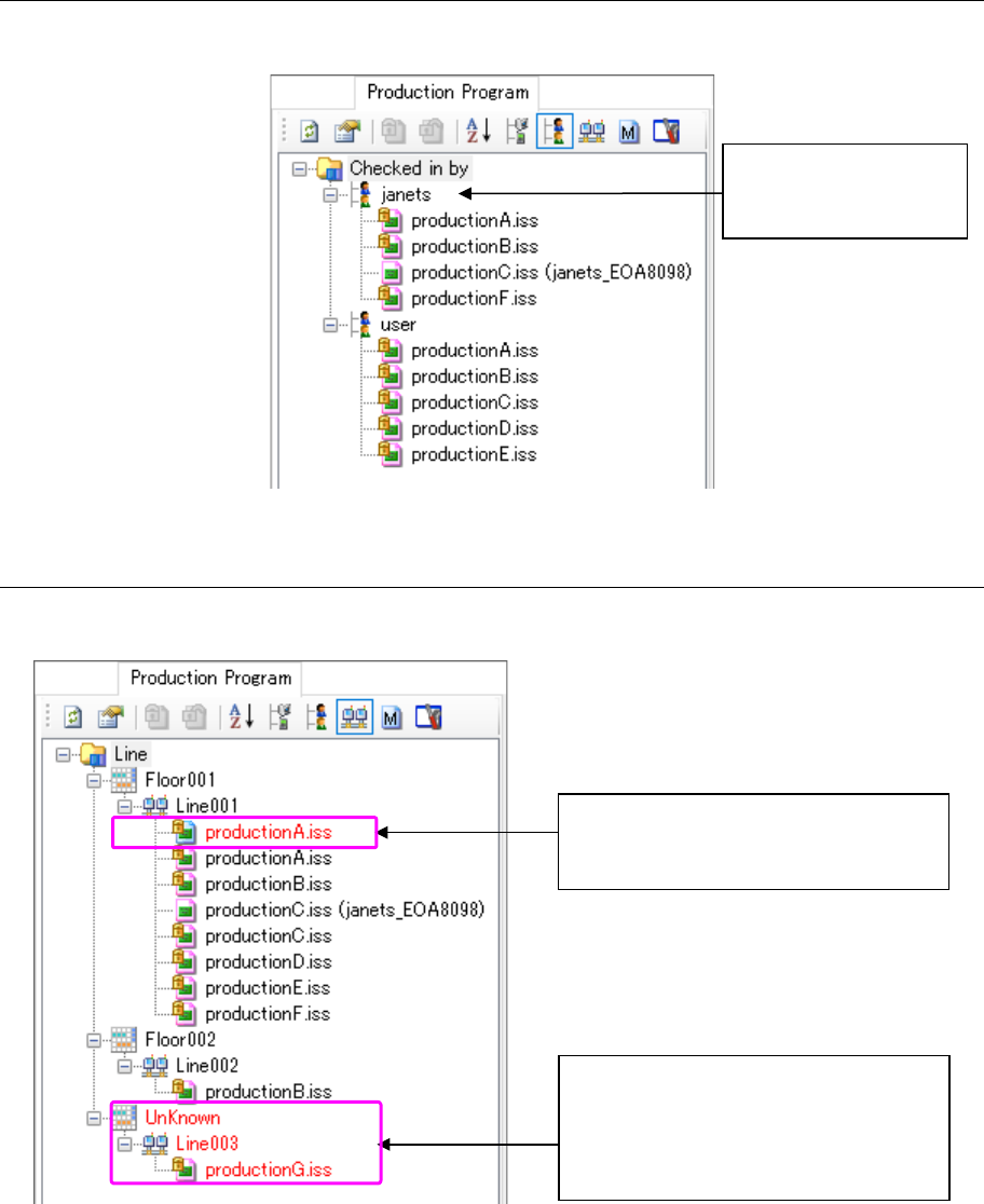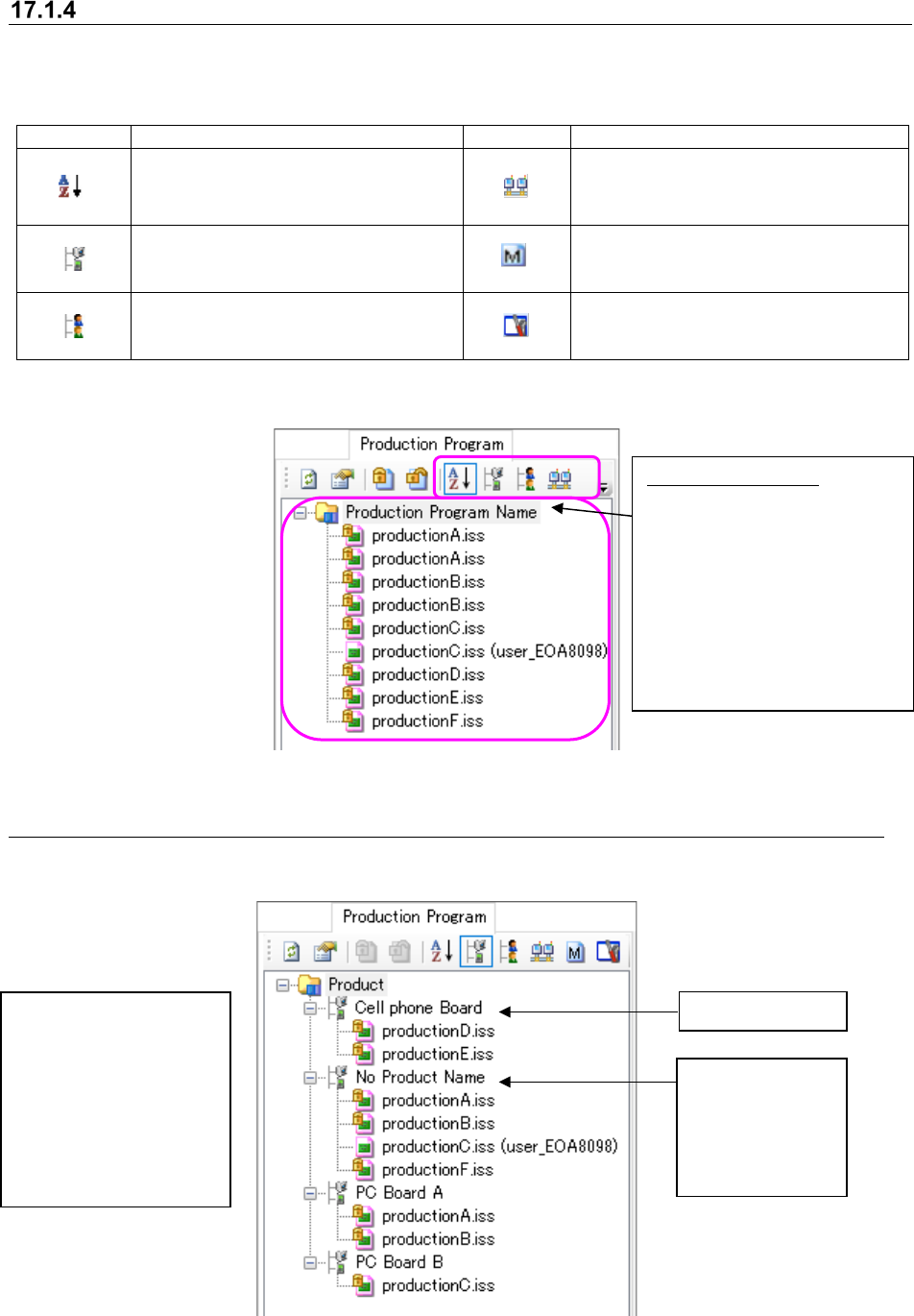 JaNets In structio n Manual 17 Program Expl orer 17 -4 “ Production P rogram ” screen The displa y functions that can be s elected by t ool bar are as shown be low . T able 17.1 -1 T ree view display function Icon Descr …