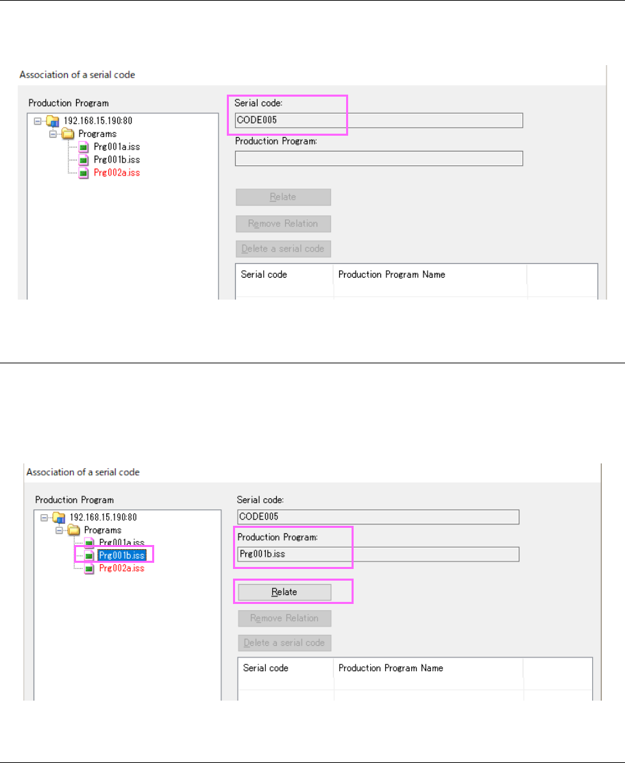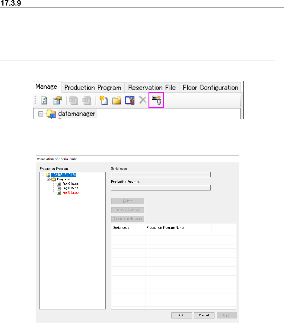 JaNets In structio n Manual 17 Program Expl orer 17 - 32 Assoc iating a serial code with a production program This functi on assoc iates a pr oduction pro gram reg ister ed in the Progr am Ex plorer with a ser ial code t…