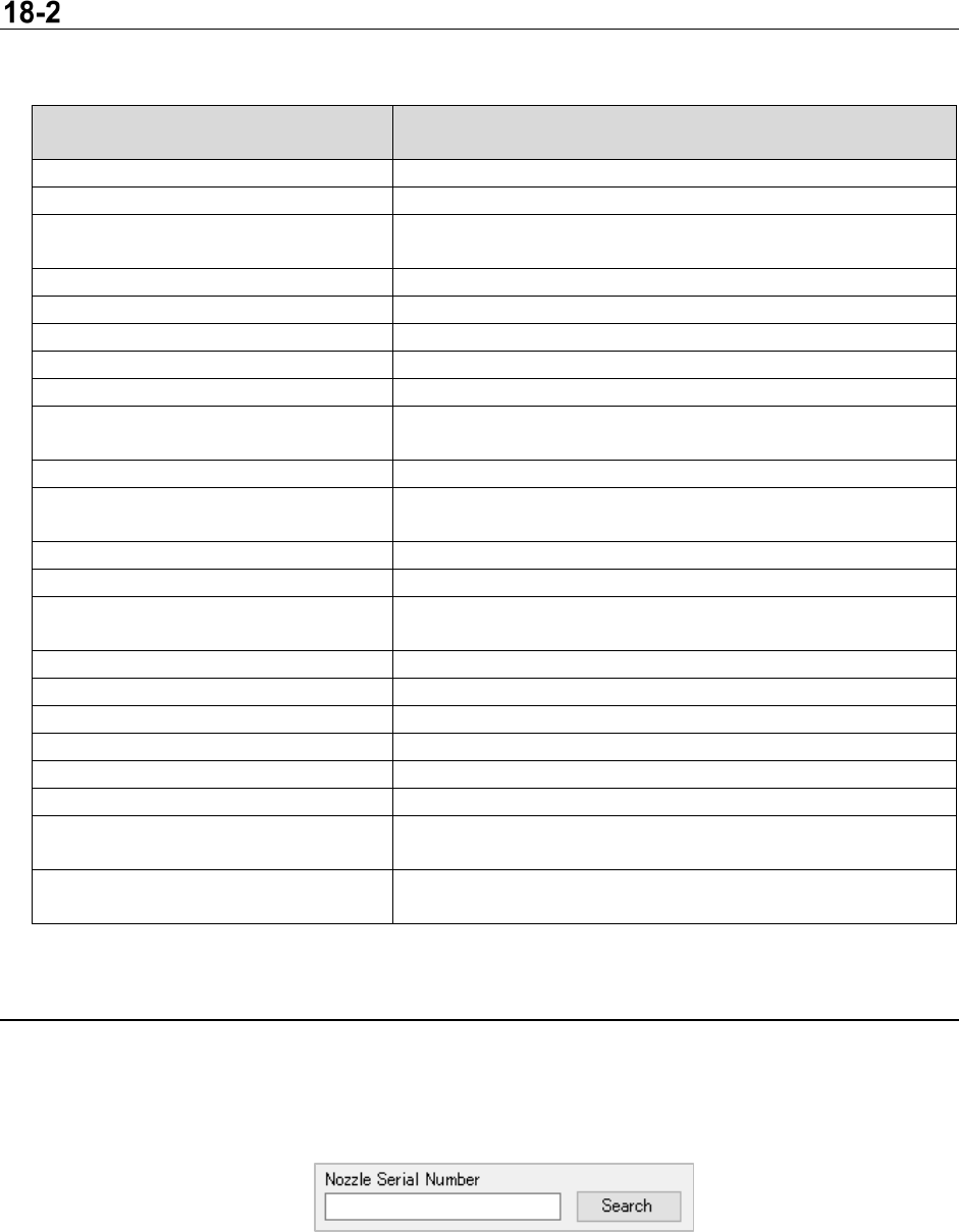 JaNets In structio n Manual 18 . N ozzle Dat a V iewer 18 -3 Displaying Nozz le Data Nozzle data is d isplayed o n the scr een. Ta b l e 18 -2-1 Items d isplayed b y the Viewer Name of an item di splayed by the Viewer De…