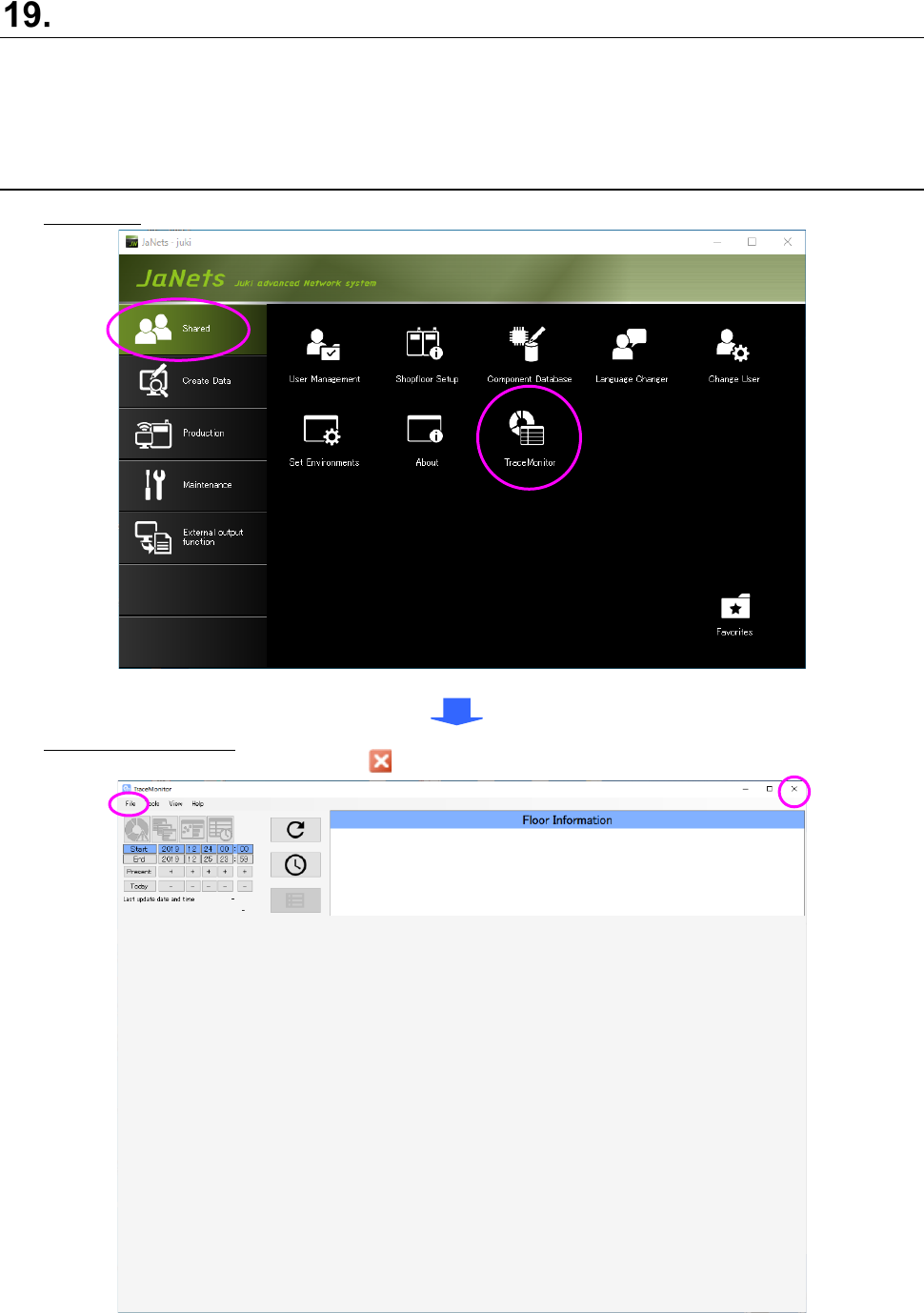 Quitting TraceMonitor: Select the [Exit TraceMonitor] command from the “File” menu or select the