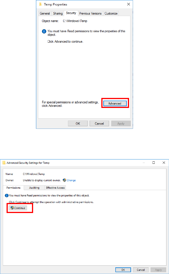 When the “Advanced Security Settings for Temp” screen appears, click the <Continue>