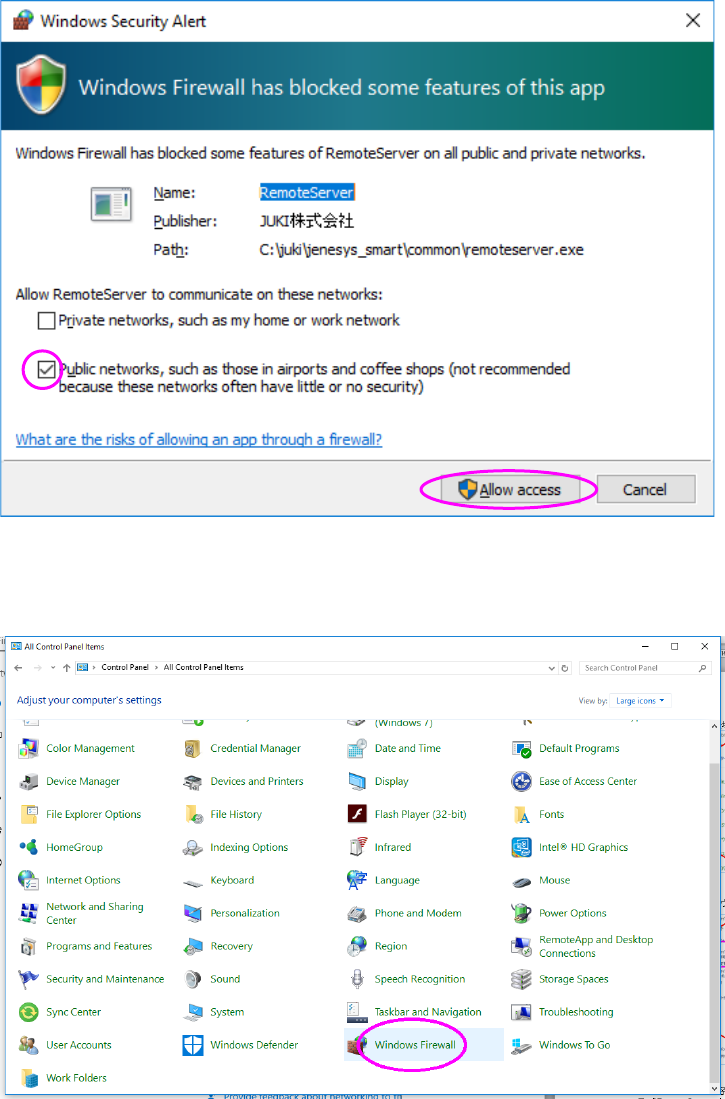JaNets Instr ucti on Man ual 3. Launcher 3-2 * When Windo ws firewall is made effe ctive A security warni ng dialog i s displayed when the la uncher is st arted. At this tim e, make sure that “Public n etwor k” is checke…