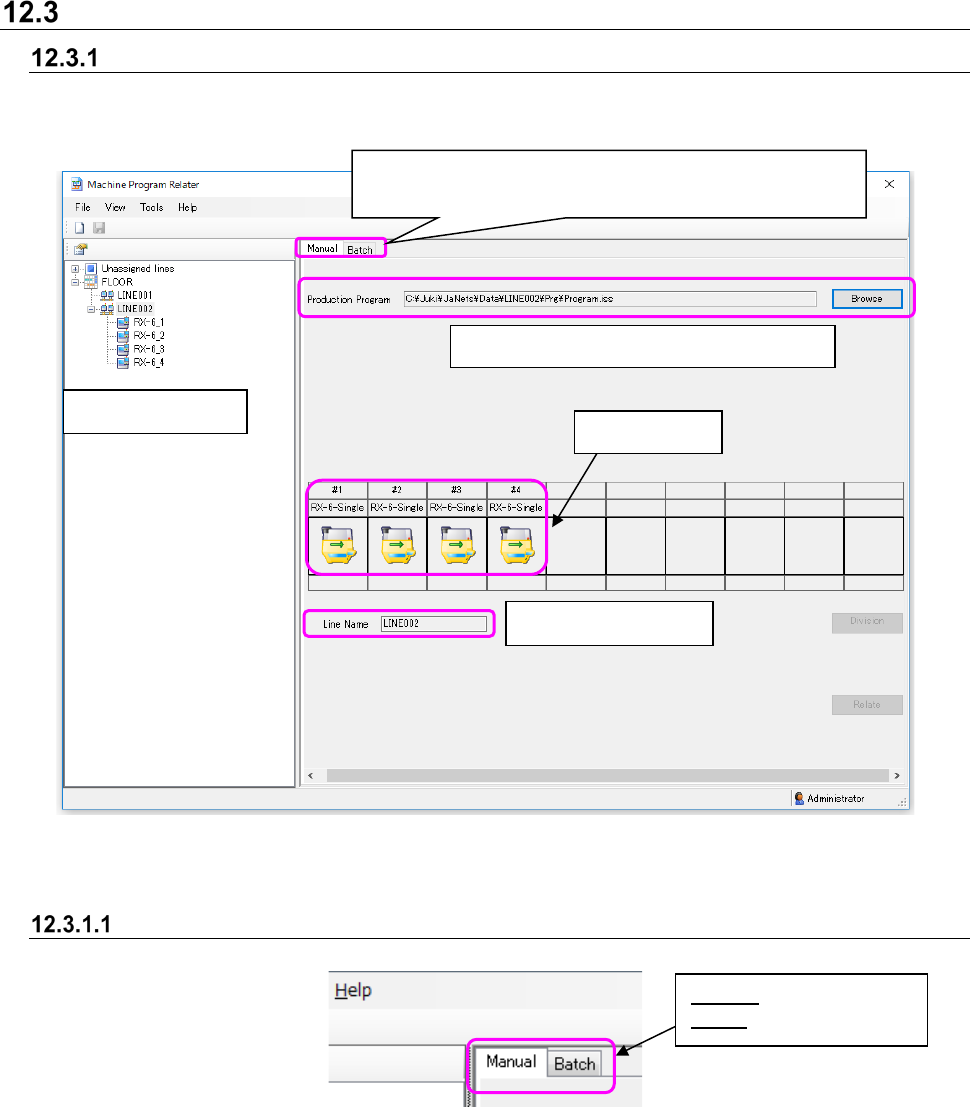 JaNets Instr ucti on Man ual 12 . Machine Program R elater 12 -4 Op erating Pro cedure Configuration of the main screen There are t wo methods f or relat ing files: “ manua l relating ” an d “ batch r elati ng. ” Switch …
