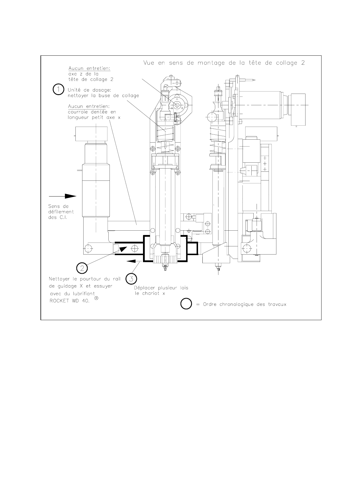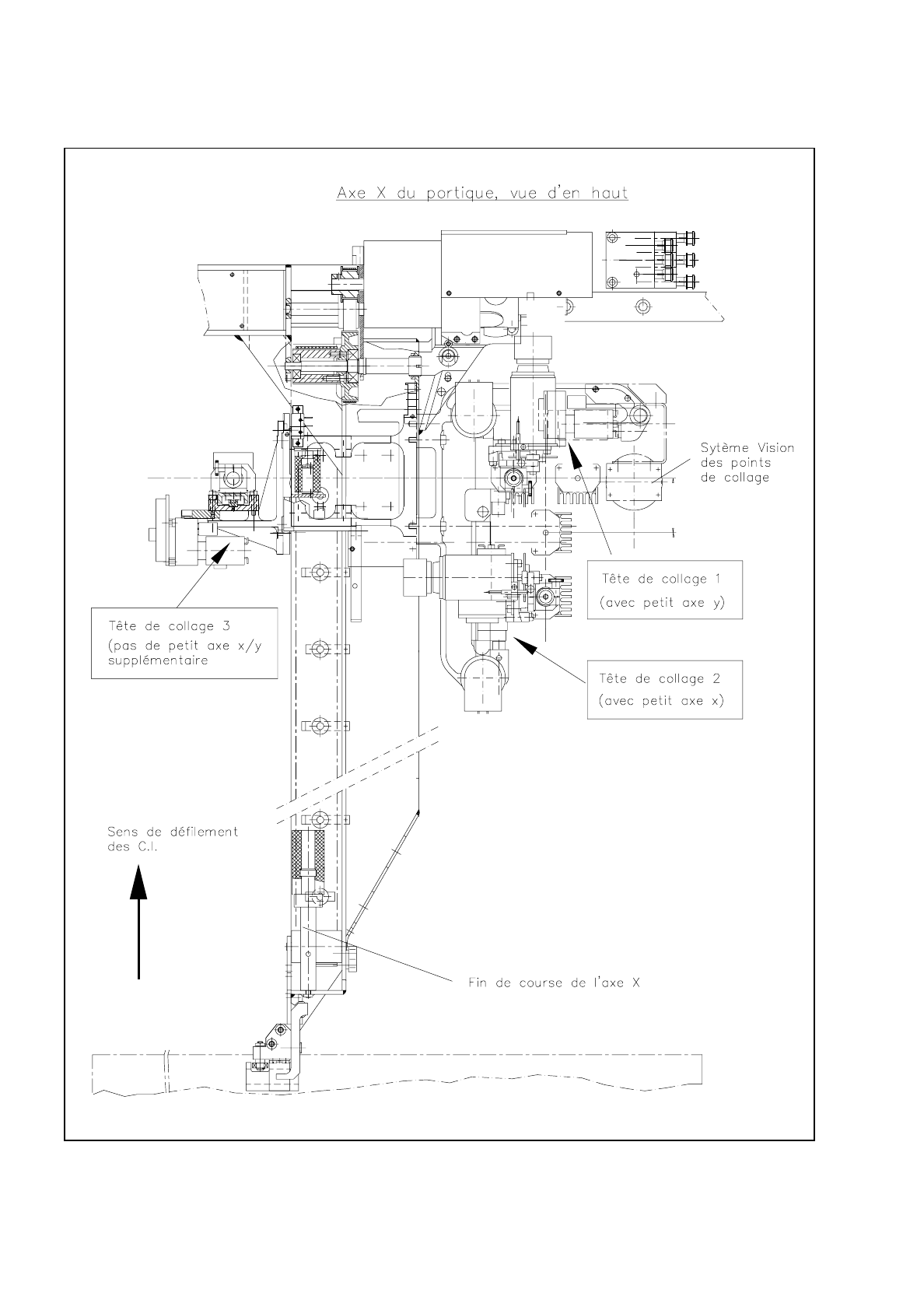 Fig. 9.9.1 Vue d’ensemble: Agencement des têtes de collage 1, 2 et 3 sur l'axe X du portique