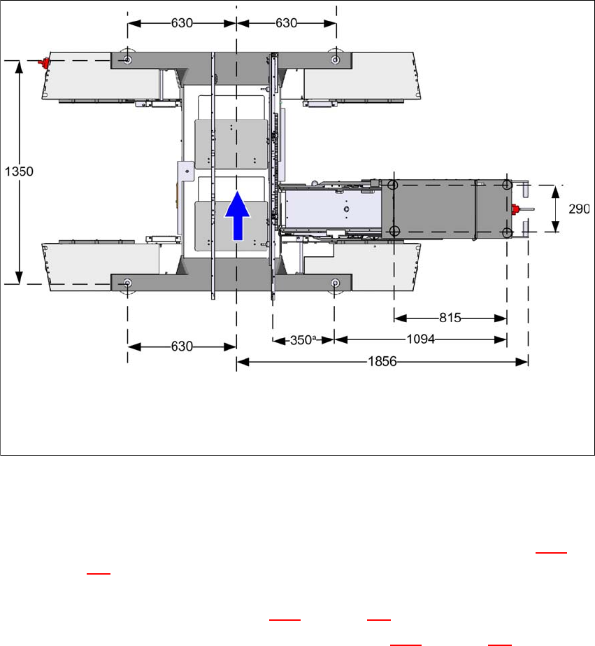 Afb. 4.3 - 6 Afstandsmaten in (mm) voor de machinevoeten in geval van dubbelvoudig printplaattransport