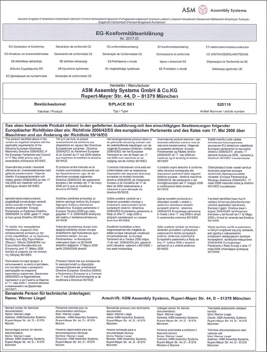 8 Bijlage Gebruikershandleiding SIPLACE SX1 /SX2 Machineversies V2 en V3 8.1 EG-Verklaringen van Overeenstemming Vanaf programmaversie SR.713.1 Editie 12-2020 350 8.1.2 SIPLACE SX1/SX2 V2 8.1.2.1 SIPLACE SX1 (520110) 8 A…