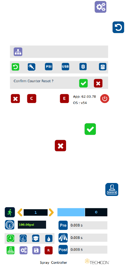 17 5.4 Cycle Counter The cycle counter records the numbers of spray cycle being activated. Up to 99 9,999 cycles can be recorded. To reset the counter, follow steps below: 1. Touch the Setup icon to enter setup screen 2.…