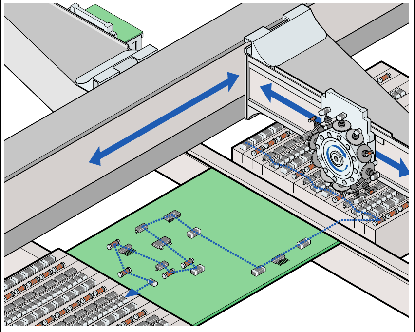 As cabeças de montar levantam os componentes dos alimentadores com posicionamento fixo