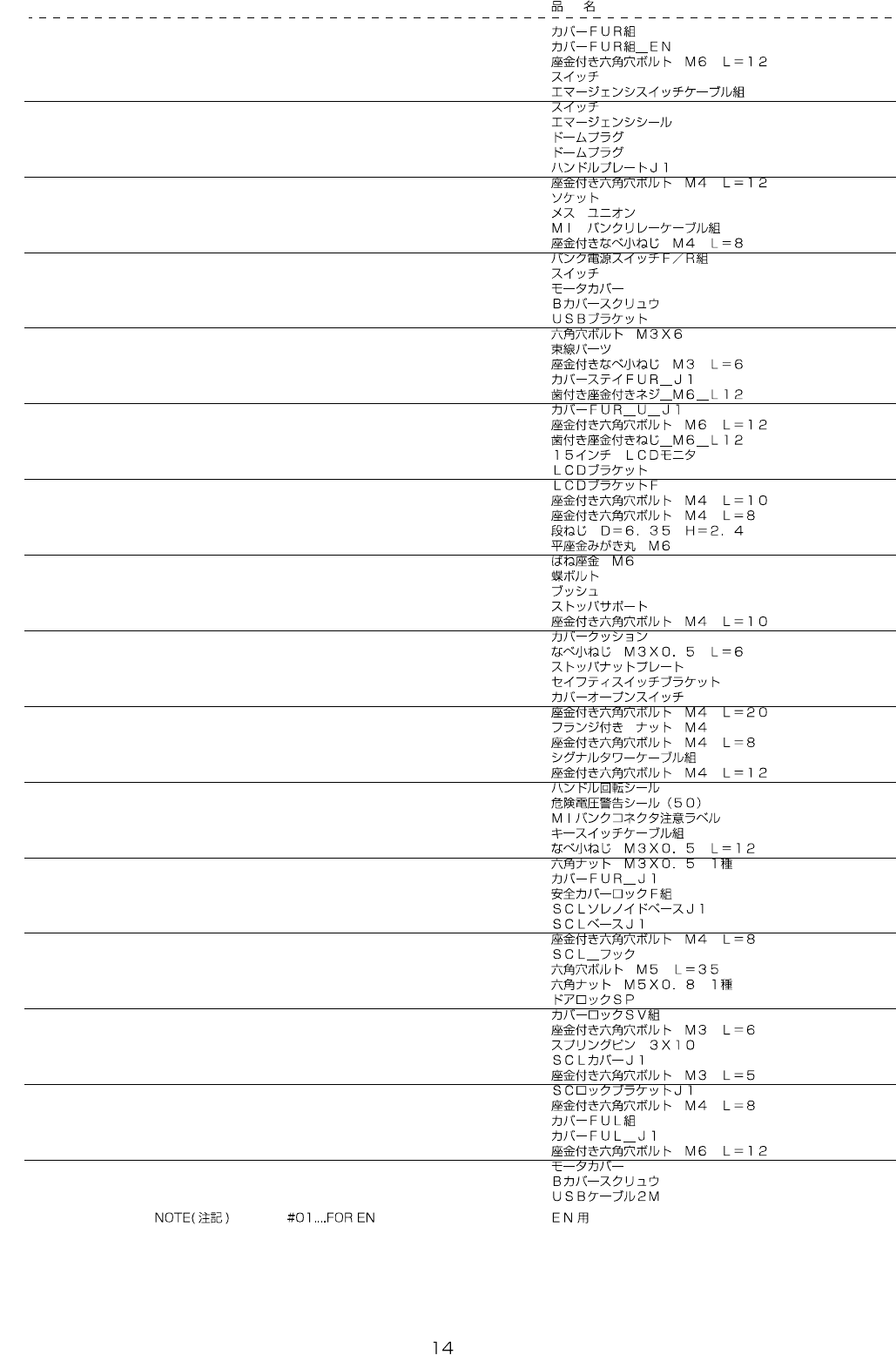 - - REF.NO NOTE PART NO DESCRIPTION Qty 1 40 2-06660 COVER_FUR_ASM 1 2 #01 402-06673 COVER_FUR_ASM_EN 1 3 SL -6061292-TN SCREWM6L=12 (4) 4 40 1-88712 SWITCH (1) 5 40 1-29025 EMGSWCABLEASM (1) 6 HA…