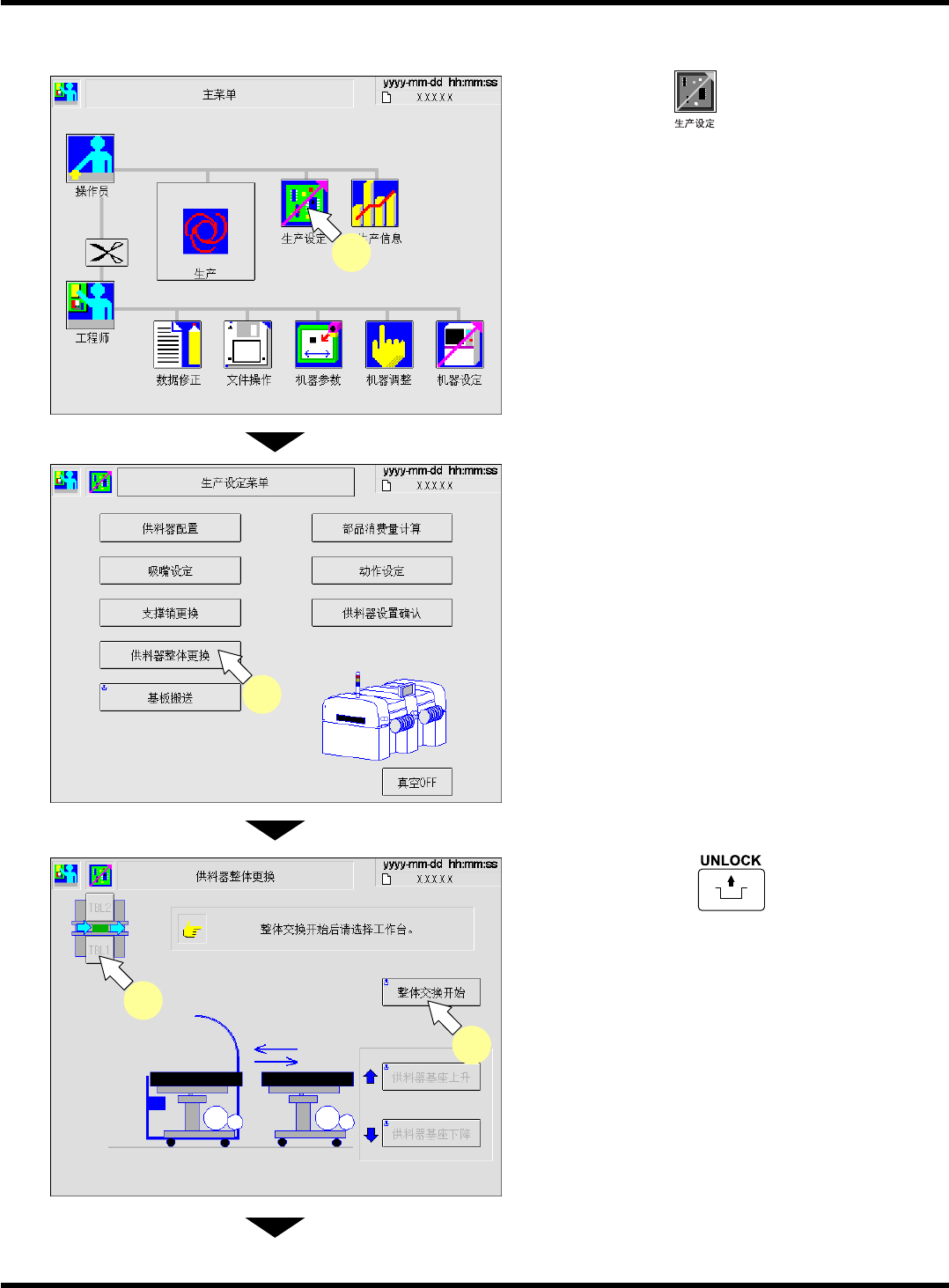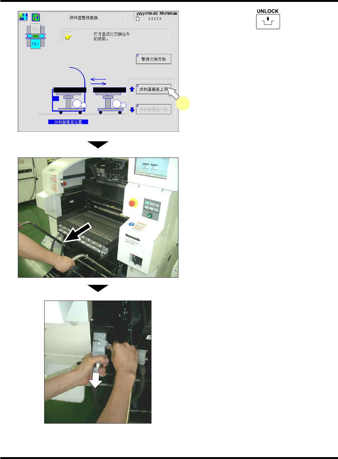 CM101-D 操作手册 3.4 整体交换台车 ( 选购件 ) 的安装和拆卸 Pa ge 3- 16 3.4.2 离线准备 使用整体交换台车准备 装置 ( 选购件 ) 设置整体交换台车的供料 器。 1. 将整体交换台车的电缆连接到整体交换台车准备装置 ( 选购件 ) 。 2. 安装所需要的供料器和元件。 关于安装供料器的方法 ,请参照 “3.1 智能供料器的设 置 ” 。 关于将元件安装到供料 器的方法,请参照供料器所 附带的使…