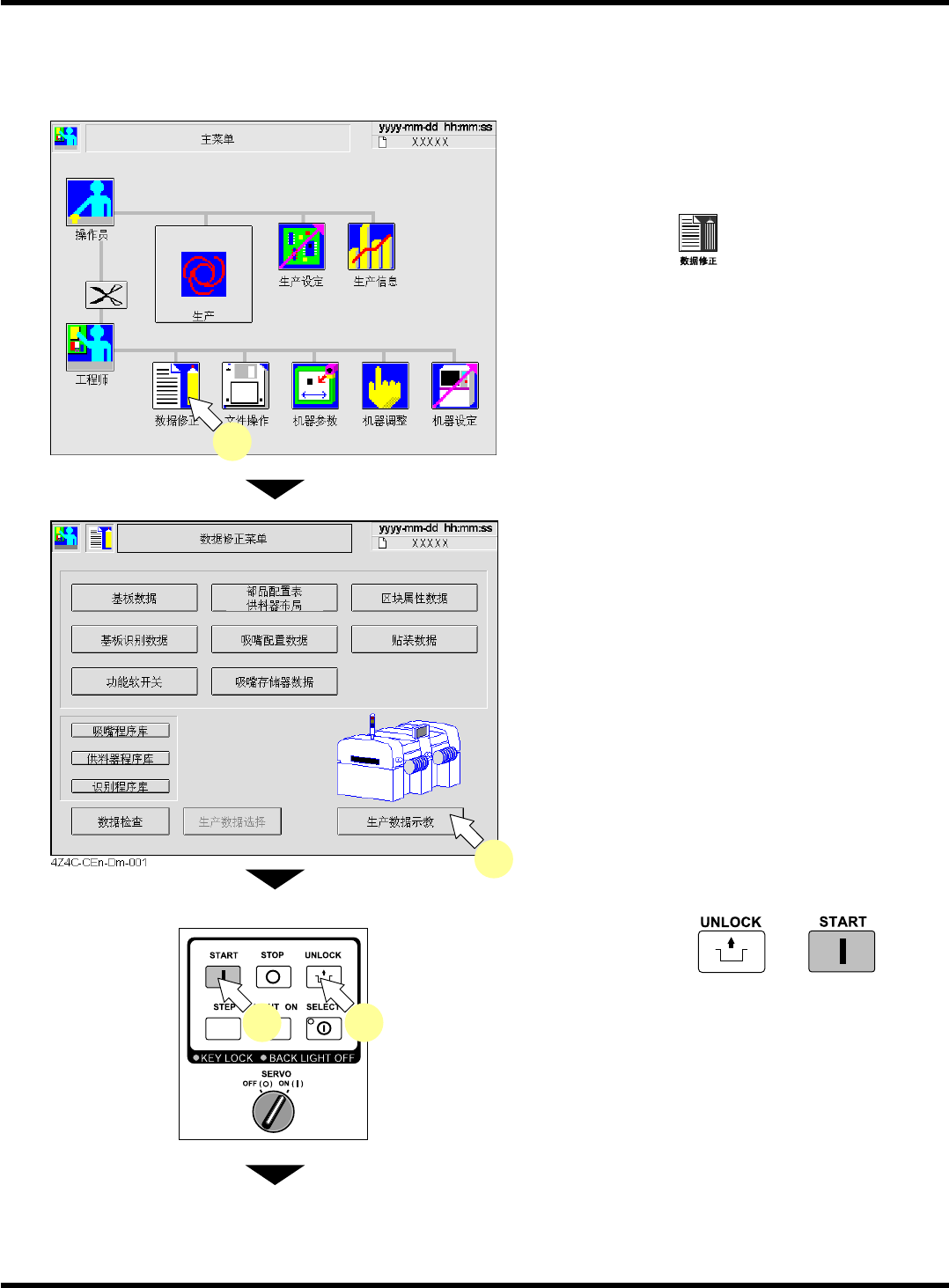 CM101-D 操作手册 4.2 基板识别示教 Page 4-6 5. 按 [ 基板识别 ] 。 • 将显示 < 基板识别 > 画面。 6. 将基板设置在基板搬入口。 7. 按操作面板的 + [ 示教开始 ] 。 • 搬入基板。 8. 打开安全盖,将基板押紧在基板止动器和 固定导轨 ( 前侧 ) 。 9. 关闭安全盖后,按 [ 完成 ] 。 • 支撑板将会上升以使基 板固定,并自动进行识 别动作。 ∗ 请在示教画面调整基板 …