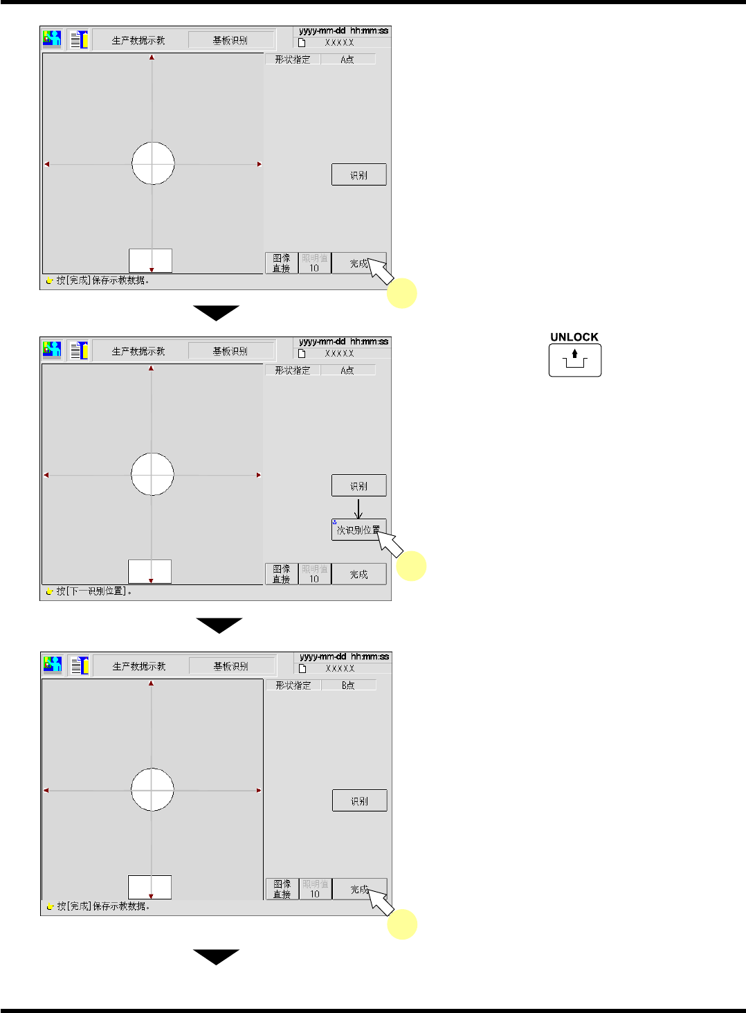 CM101-D 操作手册 4.2 基板识别示教 Page 4-7 10. 按 [ 完成 ] 。 • 自动保存数据。 11. 按操作面板的 + [ 次识别位置 ] 。 • 移向下一基板识别标记 位置,自动进行识别动 作。 12. 按 [ 完成 ] 。 • 自动保存数据。 ∗ 在基板识别上选择 [ABC 点 ] 、 [ABCD 点 ] 时, 请 重复步骤 11. ~ 12. ,同 时 对 C 点和 D 点进行示 教。 下一页 EJM5B -…