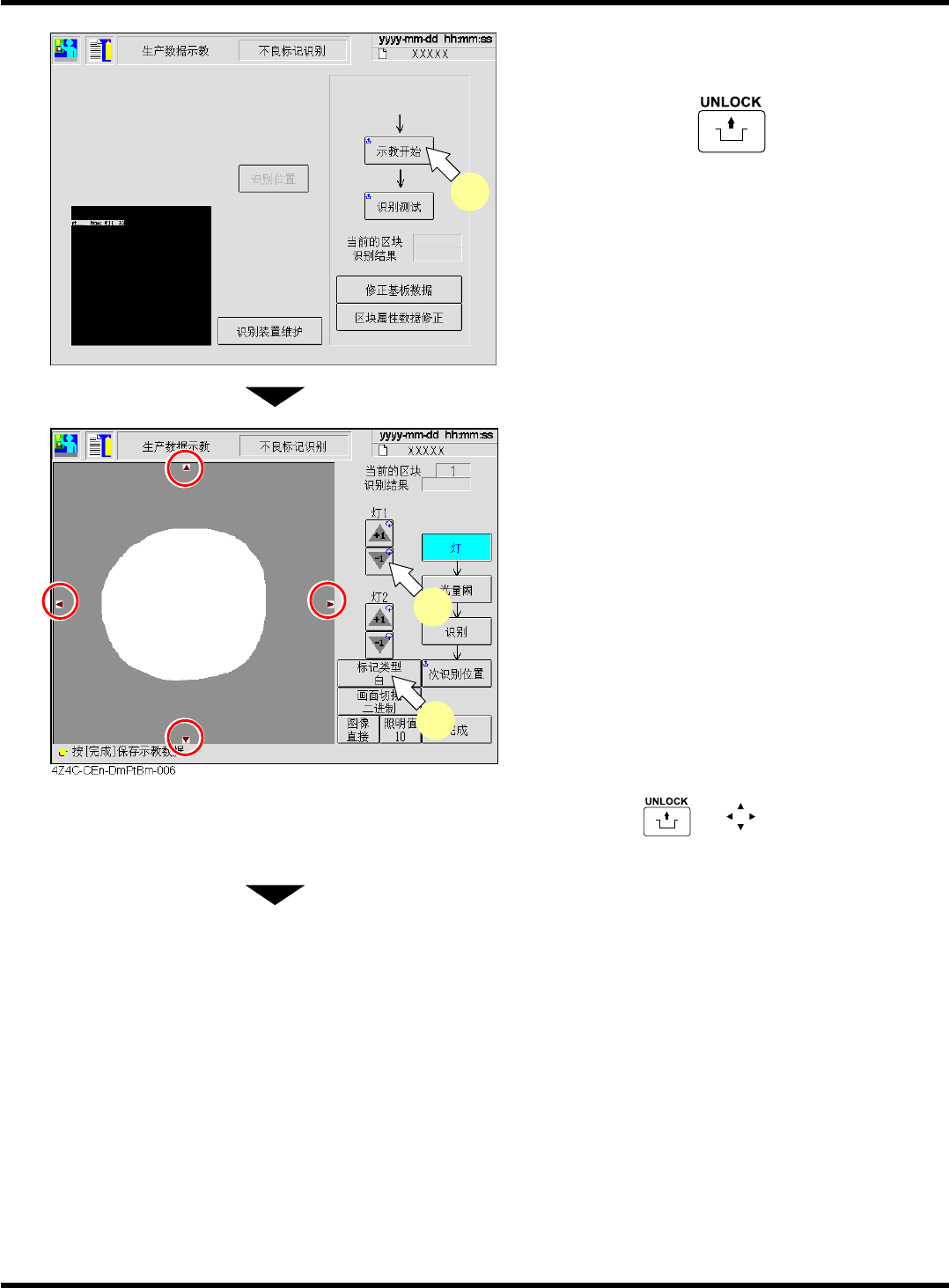CM101-D 操作手册 4.3 不良标记识别示教 Pa ge 4- 14 16. 按 [ 识别 ] 。 • 进行识别动作。 ∗ 请确认识别结果栏是否 变为 ‘OK 区块 ’ 。 17. 按 [ 完成 ] 。 • 自动保存数据,不良标 记示教结束。 18. 按操作面板的 + [ 识别测试 ] 。 • 确认识别动作是否正常 进行。 下一页 4Z4C-017E 16 EJM5B -Dm-0047 4Z4C-017E 17 EJM5B -Dm…