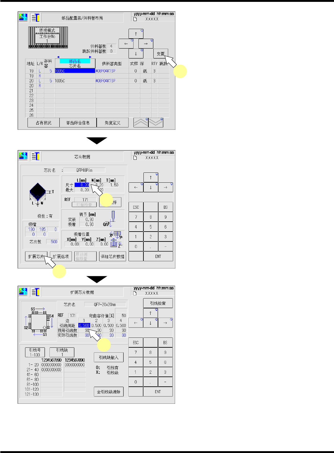 CM101-D 操作手册 4.4 芯片识别示教 Pa ge 4- 18 4.4.3 进行芯片识别示教前 识别错误多数是芯片数 据方面的问题,修正这些问 题,识别错误就会消失。 芯片识别示教在区块匹 配识别之外的芯片中主要用 于芯片数据的确认作业。 通过芯片识别示教,进 行有问题的芯片的确认,在 此之前请确认以下项目。 A) 所使用的芯片数据 是否适当 芯片数据确认前的操作步骤 1. 按主菜单的 。 2. 按 [ 部品配置表 / 供料…