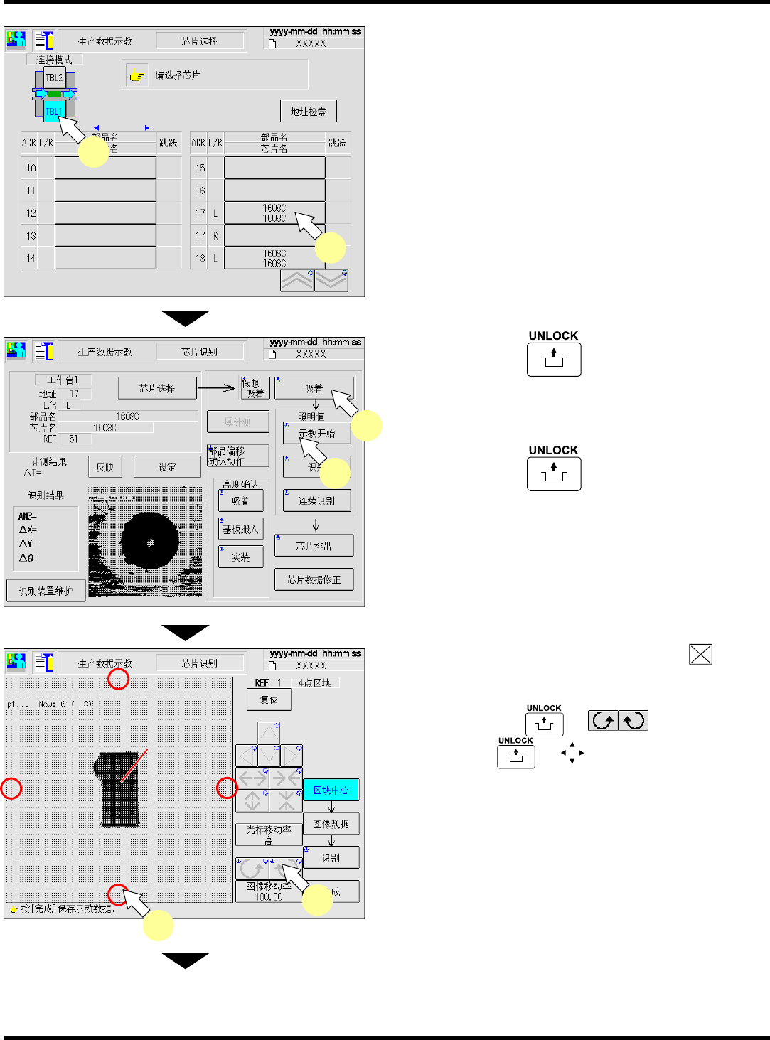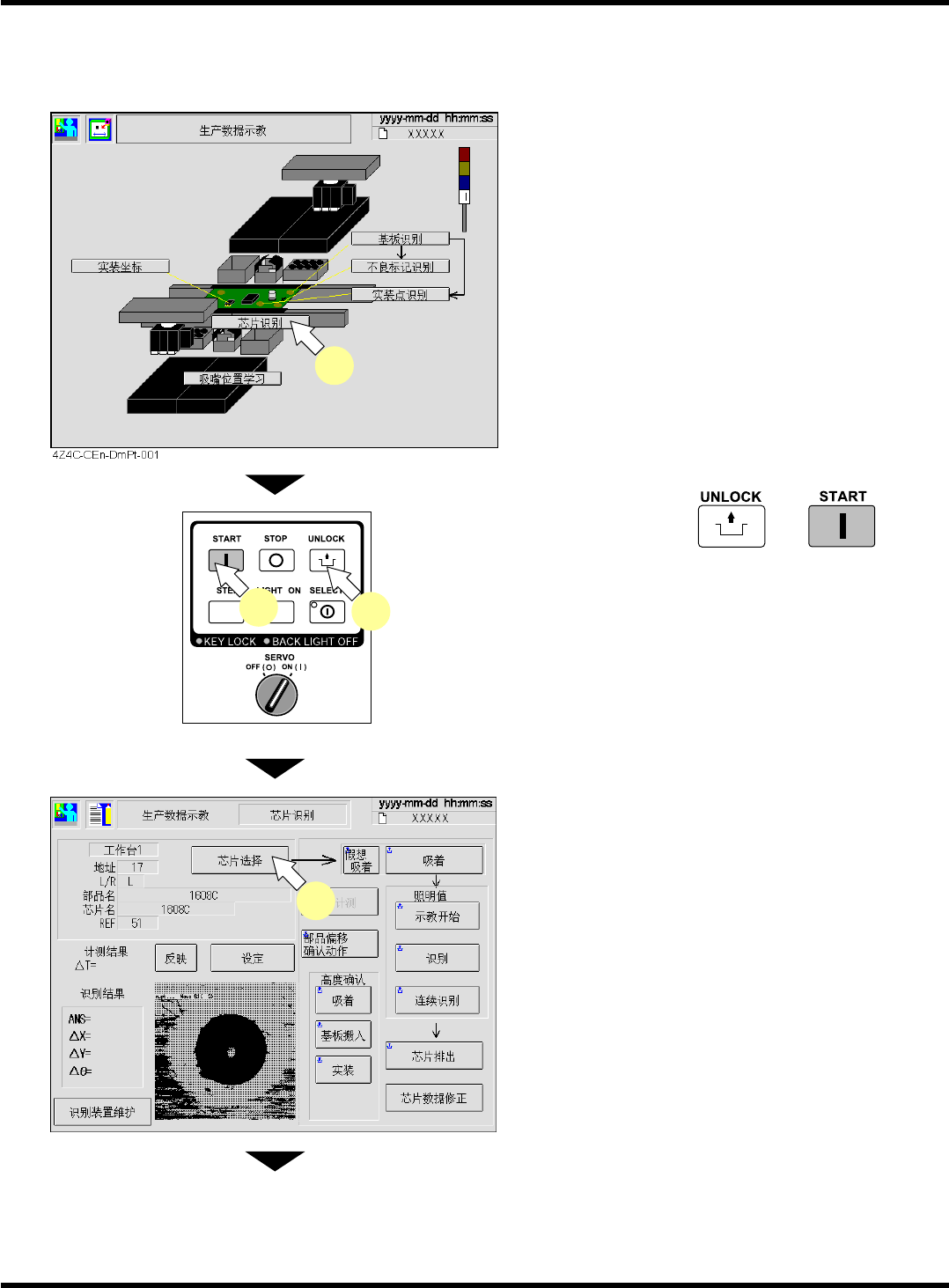 CM101-D 操作手册 4.4 芯片识别示教 Pa ge 4- 21 4.4.4 示教步骤 ( 区块匹配识别 ) 进行区块匹配识别时, 请按以下步骤进行示教。 1. 按 [ 芯片识别 ] 。 • 将显示 < 芯片识别 > 画面。 2. 按操作面板的 → 。 • 原点复归已完成,不必 进行此操作。 3. 按 [ 芯片选择 ] 。 • 将显示芯片的选择画面 。 下一页 1 EJM4A -Dm-0009 3 ACA0061A 2…