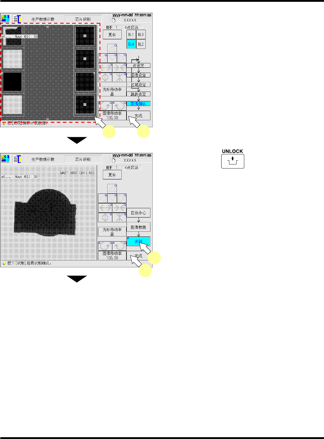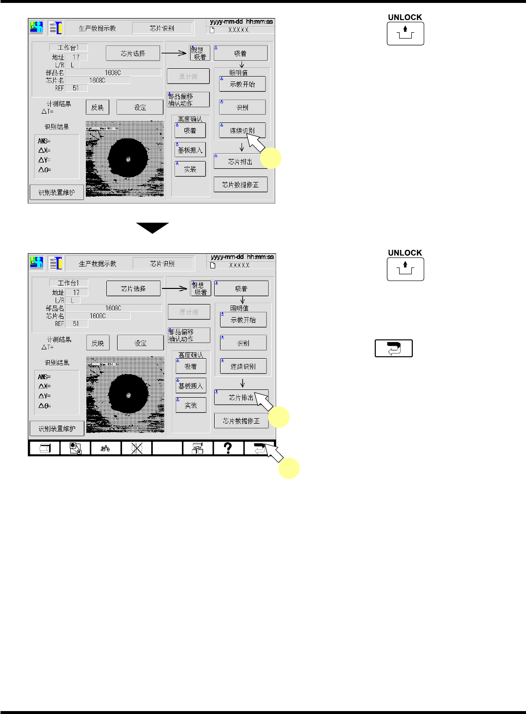 CM101-D 操作手册 4.4 芯片识别示教 Pa ge 4- 26 21. 确认示教后的图像。 • 画面左 : 识别位置 ( 点设定 ) 画面右 : 识别图像领域 ( 图像设定 ) 22. 按 [ 完成 ] 。 • 各区块的示教结束。 23. 按操作面板的 + [ 识别 ] 。 • 在识别画面上显示识别 结果。 ∗ 当识别结果 (ANS =) 在识别率 ( 机器参数的 不良判定率 ) 以下时, 通过进行步骤 6. ~ 23. 的 操…