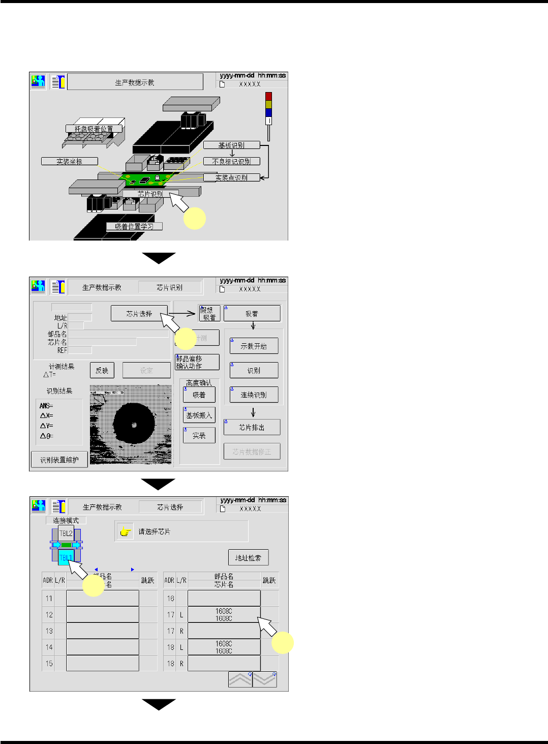 CM101-D 操作手册 4.4 芯片识别示教 Pa ge 4- 29 4.4.6 示教步骤 ( 吸着位置偏移量 ) 对吸着位置不在中心的 元件进行吸着位置 X, Y ( 芯片数据 ) 的补正。要进行位置补 正时,请按照以 下步骤执行示教。 1. 按 [ 芯片识别 ] 。 • 切换到 < 芯片识别 > 画面。 2. 按 [ 芯片选择 ] 。 • 切换到 < 芯片选择 > 画面。 3. 选择工作台。 4. 按下要识…