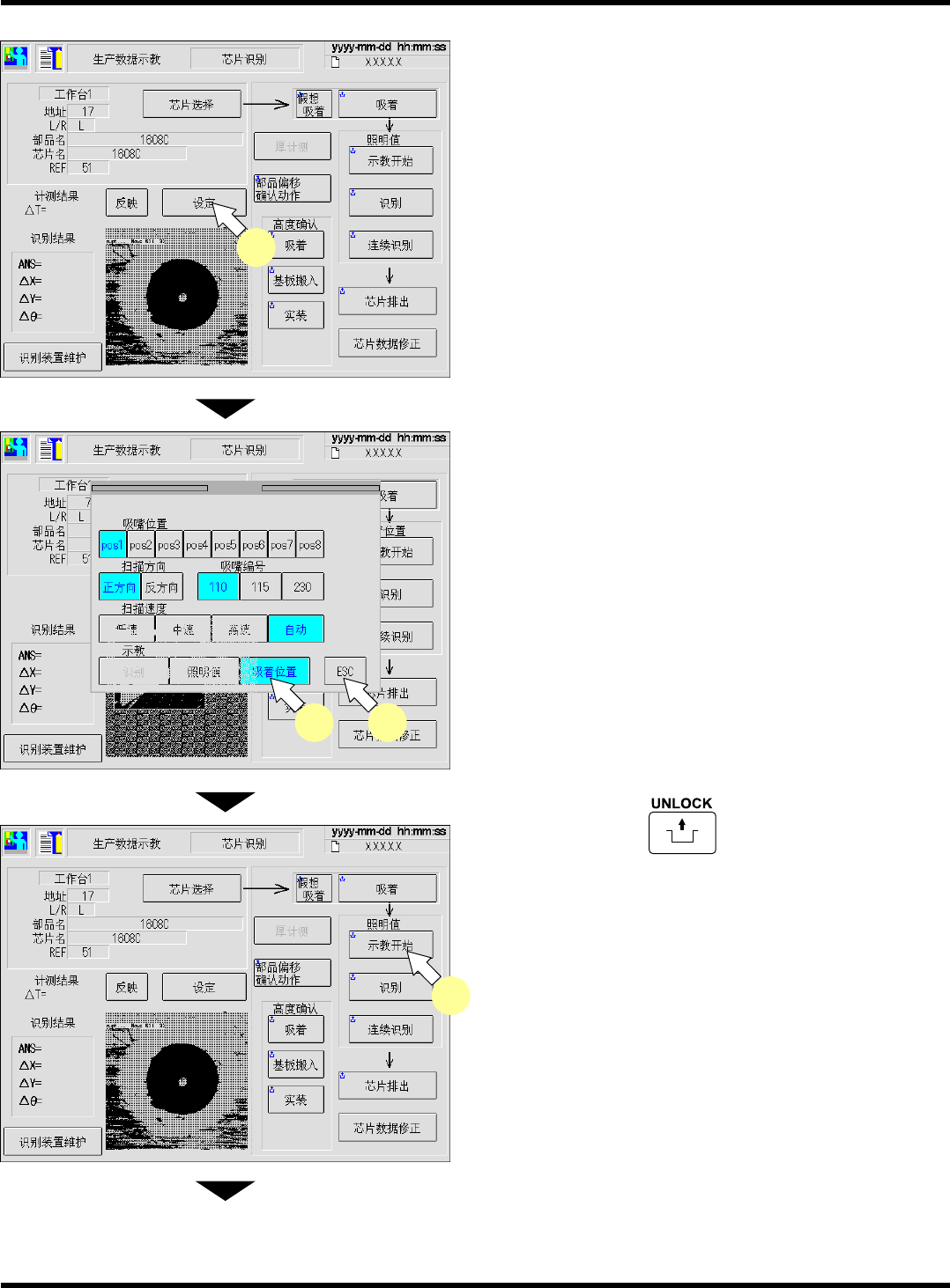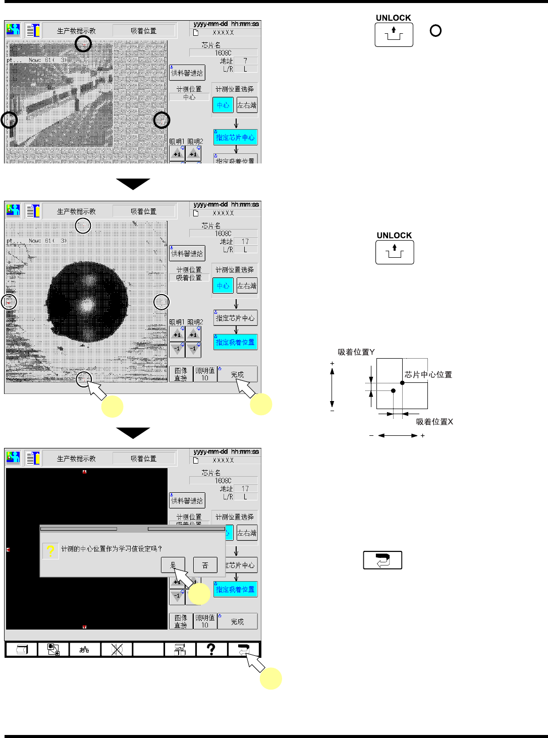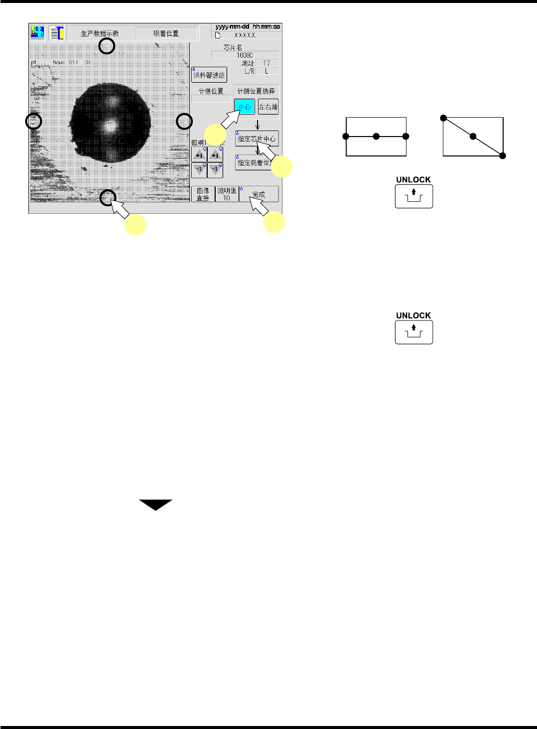 CM101-D 操作手册 4.4 芯片识别示教 Pa ge 4- 31 9. 按下计测位置选择的 [ 中心 ] 或者 [ 左右端 ] 。 [ 中心 ] 将在图象上选择的点作 为芯片的中心进行设定。 [ 左右端 ] 将在图象上选择的 2 点的中点作为芯 片的中心进 行设定。 10. 按操作面板的 + [ 指定芯片中 心 ] 。 • 吸头识别照相机移动到 所选择的元件上面。 11. 芯片移动到识别图象的中心。 12. 按操作面板的 + [ …