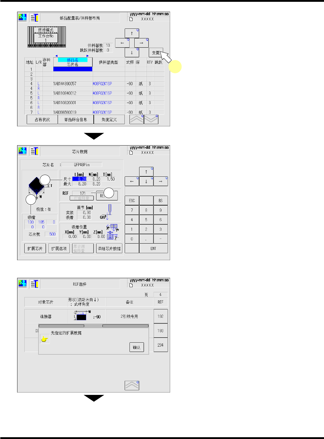CM101-D 操作手册 4.5 通过 3D 传感器 ( 选购件 ) 进行的芯片识别示教 Pa ge 4- 36 4.5.3 通过 3D 传感器进行芯片识别示教前 识别错误大多数是芯片 数据方面的问题,因此修正 这些问题,识别错误就会消 失。 芯片识别示教对区块匹 配识别以外的芯片,主要用 于芯片数据的确认作业。 通过芯片识别示教进行 有问题芯片的确认,但在此 之前请确认如下项目。 请确认所使用的芯 片数据是否适当 芯片数据确认前的…