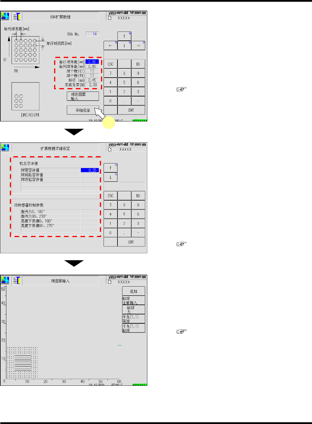 CM101-D 操作手册 4.5 通过 3D 传感器 ( 选购件 ) 进行的芯片识别示教 Pa ge 4- 39 9. 按 [ 扩展芯片 ] 后, 选择 QFP 时进行下一步 骤,选择 BGA 时进行步骤 12. 。 10. 选择 QFP 时,确认扩展数据,并按下 [ 详 细设定 ] 。 1. ‘ 引线间距 ’ 2. ‘ 引线数 ’ 3. ‘ 引线宽 ’ 4. ‘ 引线长 ’ ( 程序手册 ) 11. 选择 QFP 时, 确认扩展数据的…