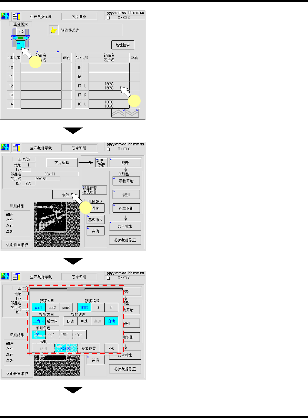 CM101-D 操作手册 4.5 通过 3D 传感器 ( 选购件 ) 进行的芯片识别示教 Pa ge 4- 42 4. 选择工作台。 5. 按下要识别的芯片。 6. 按 [ 设定 ] 。 7. 设定识别条件。 1. ‘ 吸嘴位置 ’ 2. ‘ 吸嘴编号 ’ 3. ‘ 扫描方向 ’ 4. ‘ 扫描速度 ’ (3D 传感器不能选择 [ 高速 ]) 5. ‘ 识别角度 ’ 6. ‘ 示教 ’ 下一页 EJM5B -Dm-0057 EJM5B-…