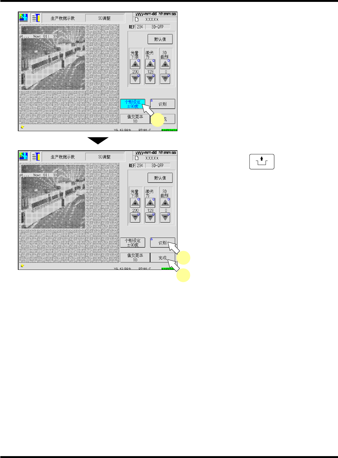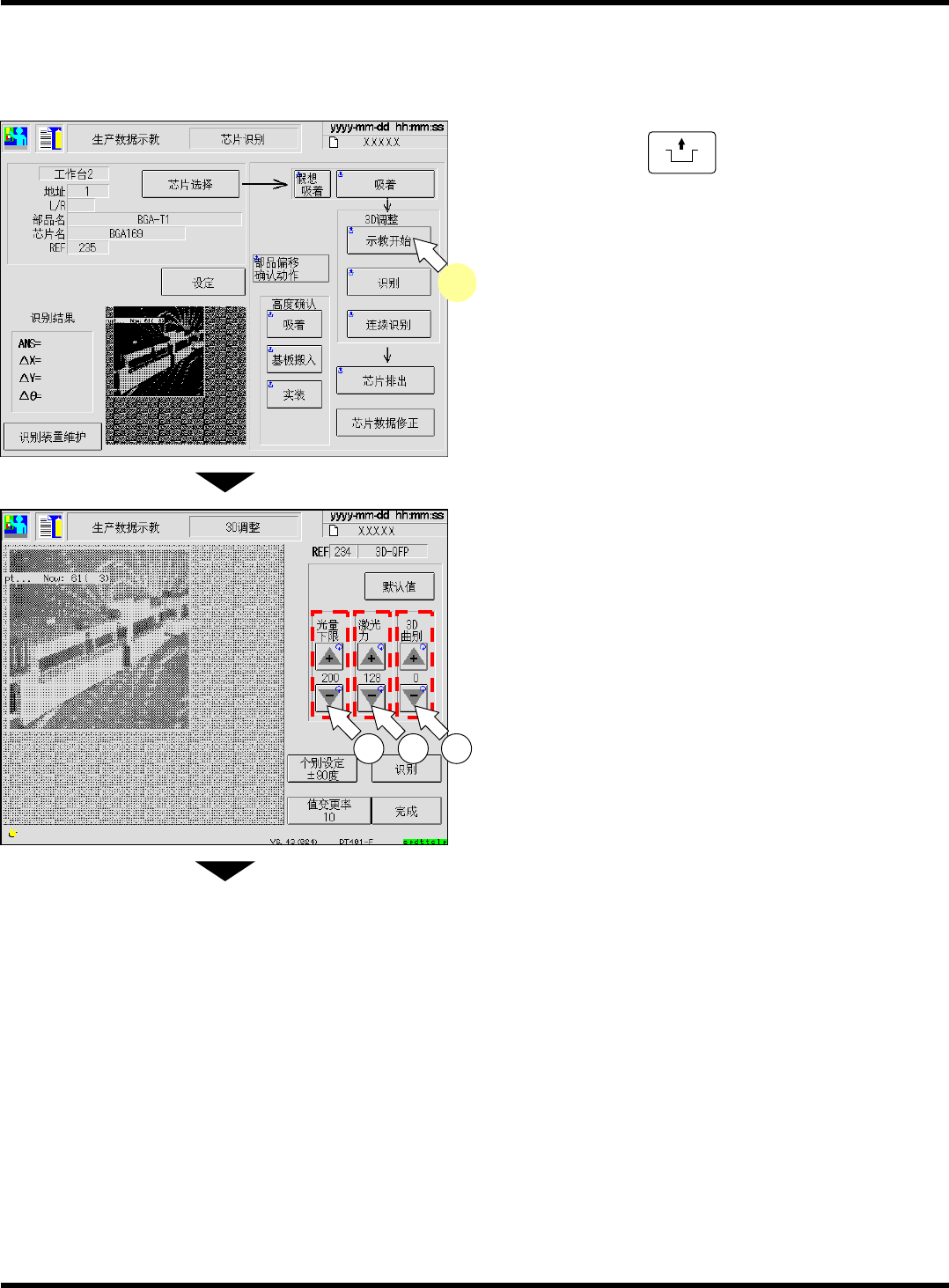 CM101-D 操作手册 4.5 通过 3D 传感器 ( 选购件 ) 进行的芯片识别示教 Pa ge 4- 45 5. 按 [ 个别设定 ± 90 度 ] 。 • 当识别角度为 + 90 ° 和 − 90 ° 时, [ 个别设定 ± 90 度 ] 就处于 ON ( 蓝色 ) 状态,显示识别角 度 ± 90 ° 的 ‘ 光量下限 ’ 、 ‘ 激光力 ’ 的数值,并成为 可变更設 定的状态。 ∗ 在上述的状态时,请进 行步骤 2. 、 3.…