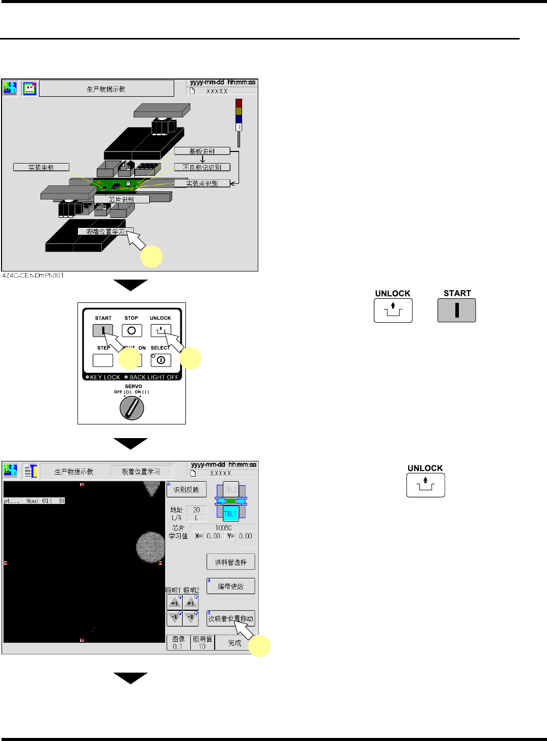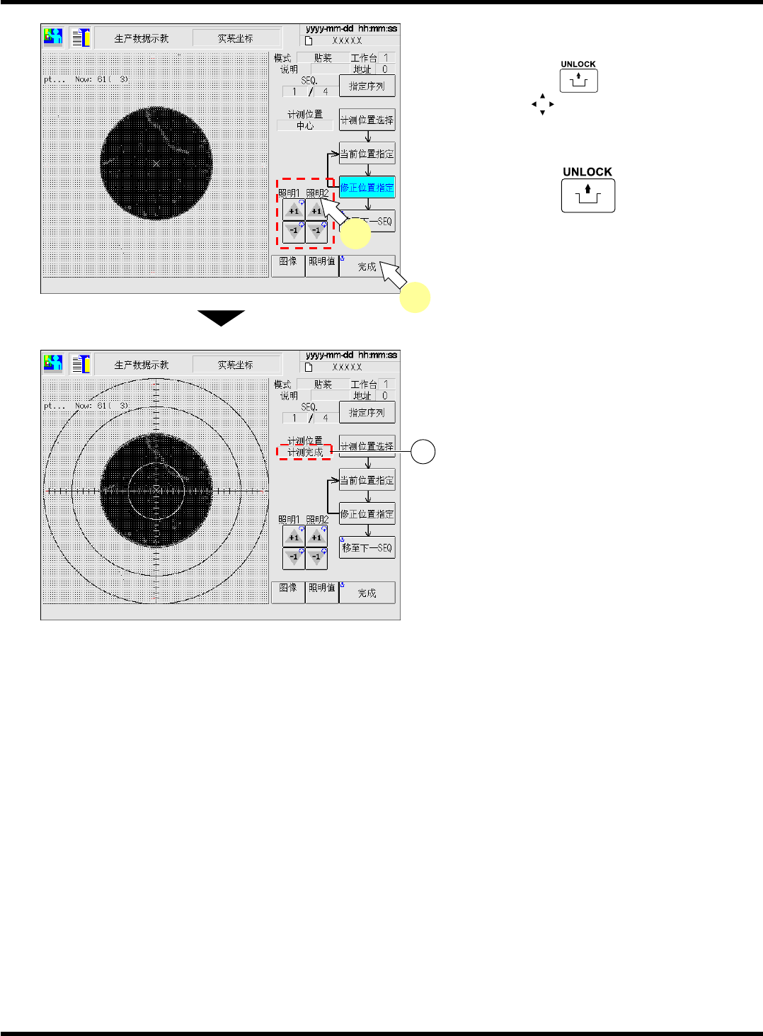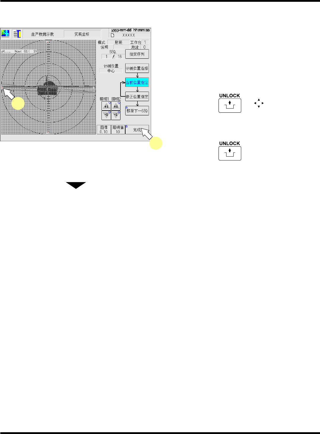 CM101-D 操作手册 4.6 实装坐标示教 Pa ge 4- 55 5. 调整照明值,使画面清晰可见。 ∗ 按操作面板的 的同时按下识别画面的 红色三角 ,将现在状态位置移至指 定的修 正位置。 6. 按操作面板的 + [ 完成 ] 。 ∗ 照相机移向下一计测位 置。 请对所选择的位置同样 进行步骤 5. ~ 6. 的操 作,并调整。 • 所有计测点的示教一结 束,就会根据所示教的 坐标计算出中心位置并 保存数据,显示 “ 计测完 …