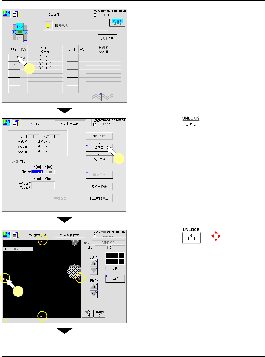 CM101-D 操作手册 4.8 托盘数据的示教 ( 选购件 : 手放托盘供料器 ) Pa ge 4- 61 4. 按操作面板的 → 。 • 原点复归已完成,不必 进行此操作。 5. 按 [ 托盘吸着位置 ] 。 6. 按 [ 地址选择 ] 。 下一页 4 4 EJK1A-Dm -0001 5 EJM5B -Dm-0065 6 EJM5B- C-OMC04-A02- 00