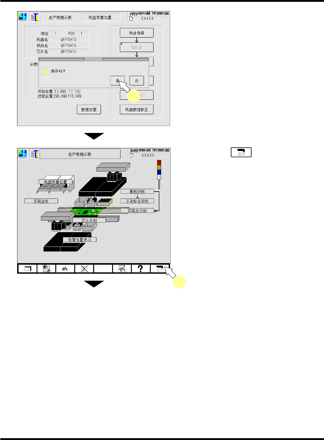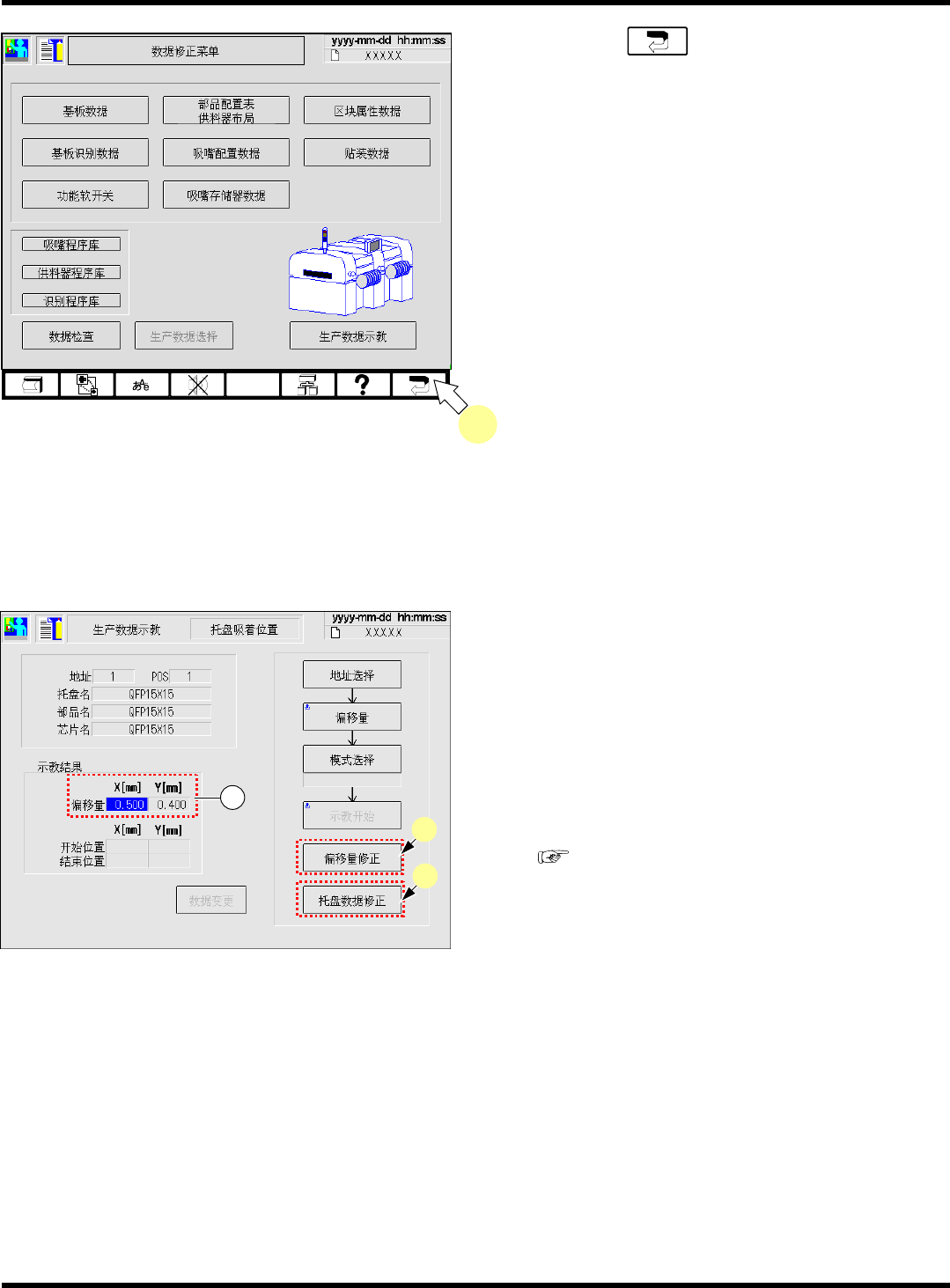 CM101-D 操作手册 4.8 托盘数据的示教 ( 选购件 : 手放托盘供料器 ) Pa ge 4- 68 23. 按功能键的 。 • 回到主菜单画面。 = 通知 = 照相机通过 [ 示教开始 ] 来移动后的位置大 为偏离时,请用手输入变更 数据后,再次进行 [ 示教开始 ] 。 a. ‘ 偏移量修正 ’ 在画面上单击来选择 ‘ 示教结果 ’ 的偏移量 X, Y ,再 按 [ 偏移量修正 ] 后, 将会显示数值输 入 画面并可以设…