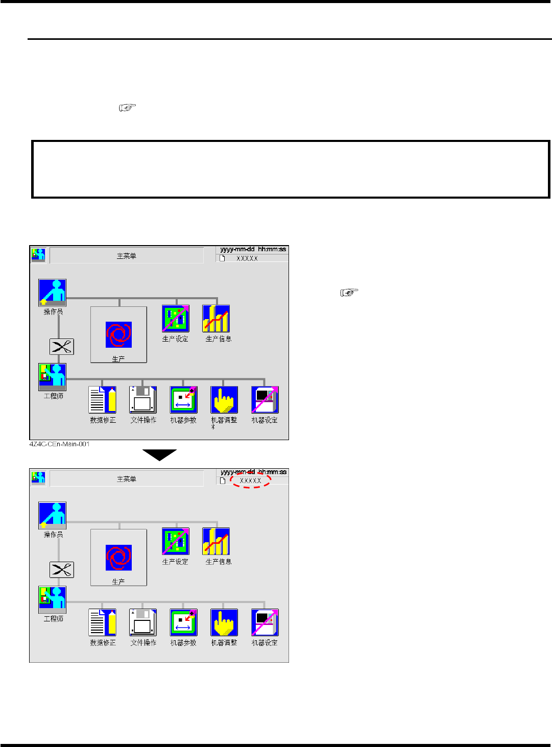 CM101-D 操作手册 5.2 生产数据的变更 Page 5-4 B) 在文件操作中读取 1. 按主菜单的 。 • 将显示文件操作的画面 。 2. 按 [PT] 。 • 将设备选择切换为 PT 。 • 显示出用 PT 所登录的数据列表。 3. 选择读取的数据名。 • 反转显示所选择的数据 名。 • 按 [ 分类 ] ,数据就会按日期 先后的顺序进行排 列。 4. 按 [ 读取 ] 。 5. 按 [ 是 ] 。 • 显示 “ 数据读取中…