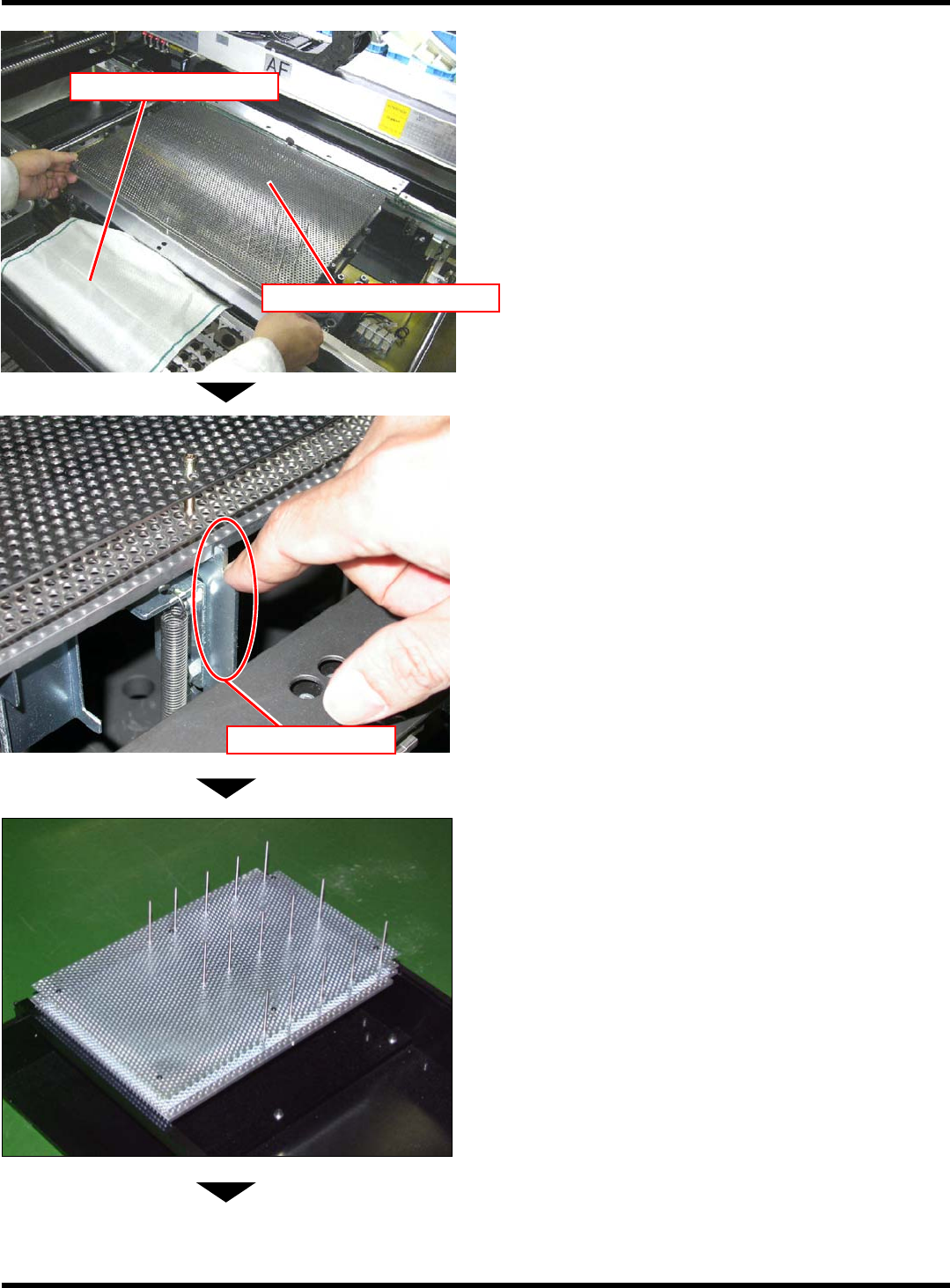 CM101-D 操作手册 5.4 支撑销的安装 Page 5-9 8. 安装基板支撑块。 • 请用双手托住从前侧缓 慢插入。 9. 关闭安全盖。 10. 取出棉纱布。 11. 将伺服开关置于 ON ( I ) 。 12. 按操作面板的 + [ 支撑销更换完 成 ] 。 • 基板支撑块将下降。 13. 按功能键的 。 • 返回至生产设定菜单的 画面。 14. 按功能键的 。 • 返回至 < 主菜单 > 画面。 EJM5B -0…