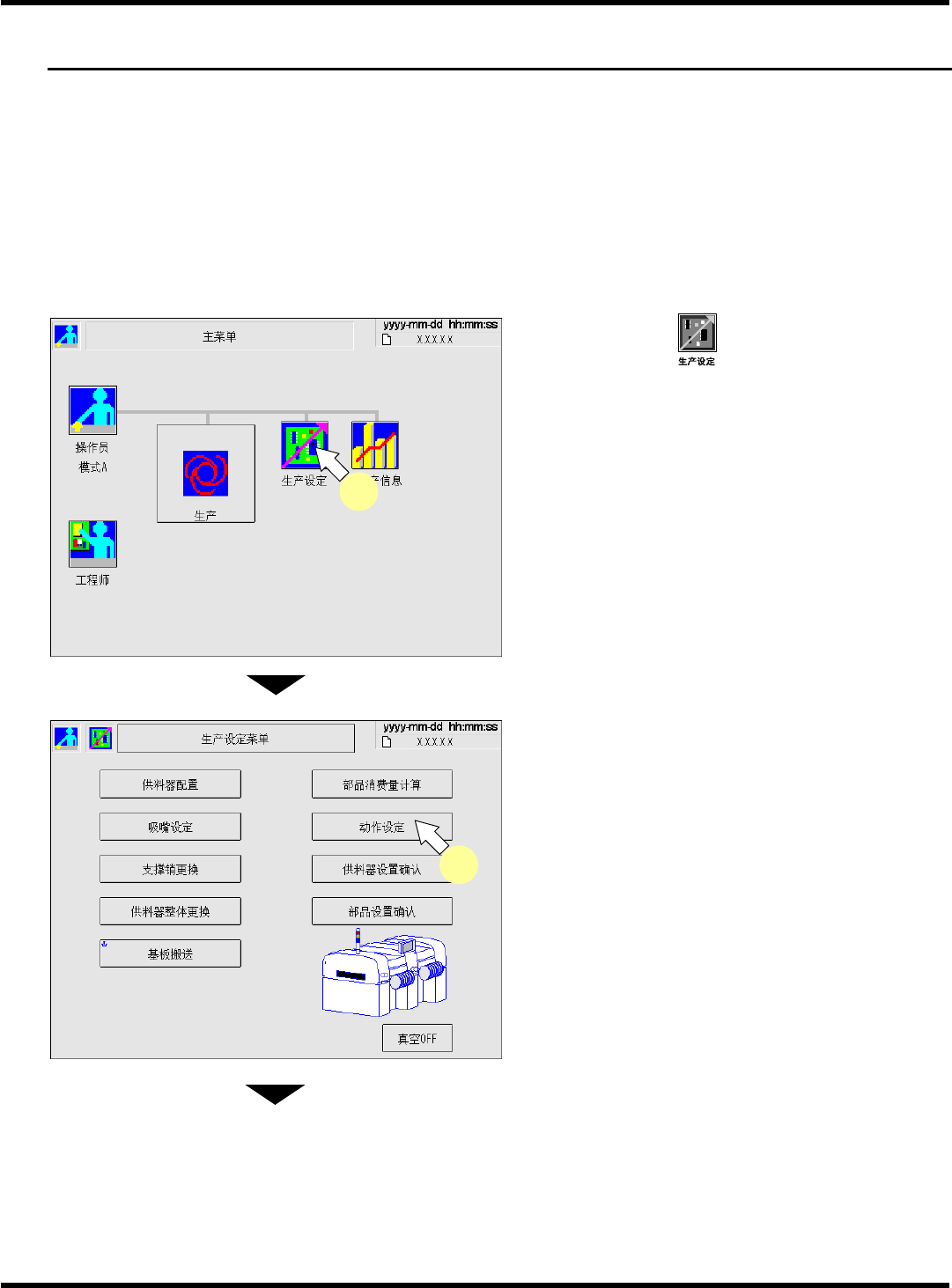 CM101-D 操作手册 5.9 因反面实装变更动 作设定 Pa ge 5- 24 通知 默认值已设定为 ‘ 无 ’ 。 只要用户不设定,此数据也不会改变。 3. 欲生产反面已有实装的基板时, 将 ‘ 反面实 装 ’ 设为 [ 有 ] 。 • 生产过程中,为保护反 面芯片,将基板支座加 以变更以确认下降后排 出基板。 反面实装时的支撑操作概念 将反面实装设定为有时 将反面实装设定为无时 支撑销将要下降 将要搬送基板 • 支撑…